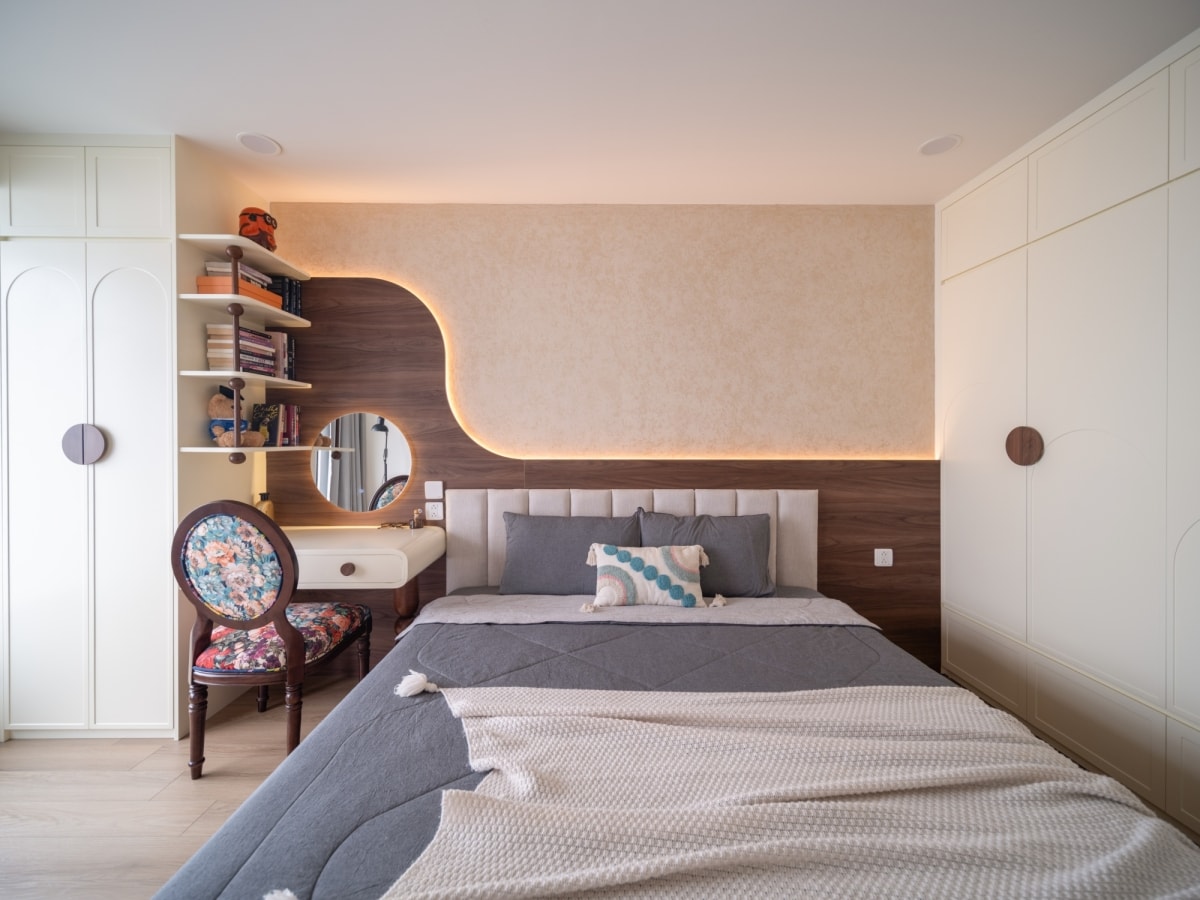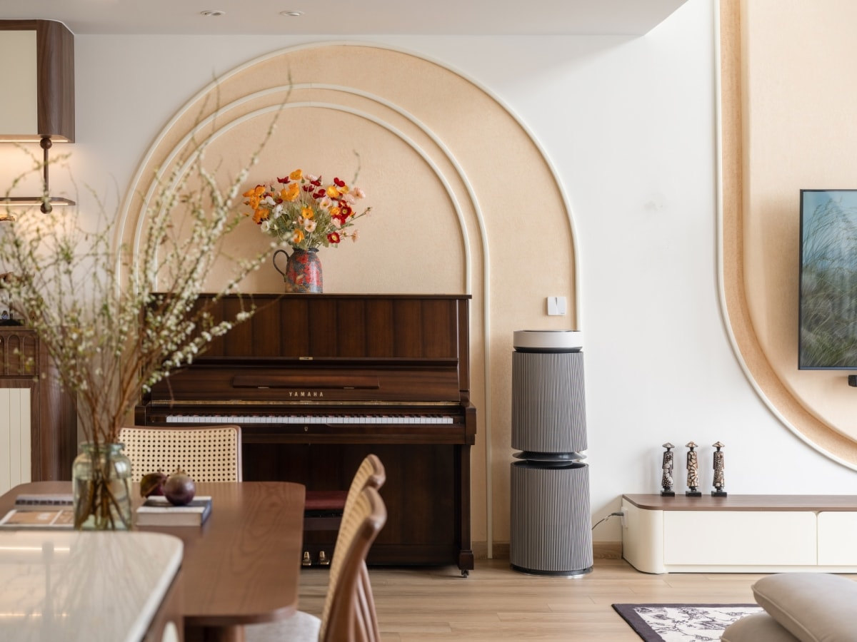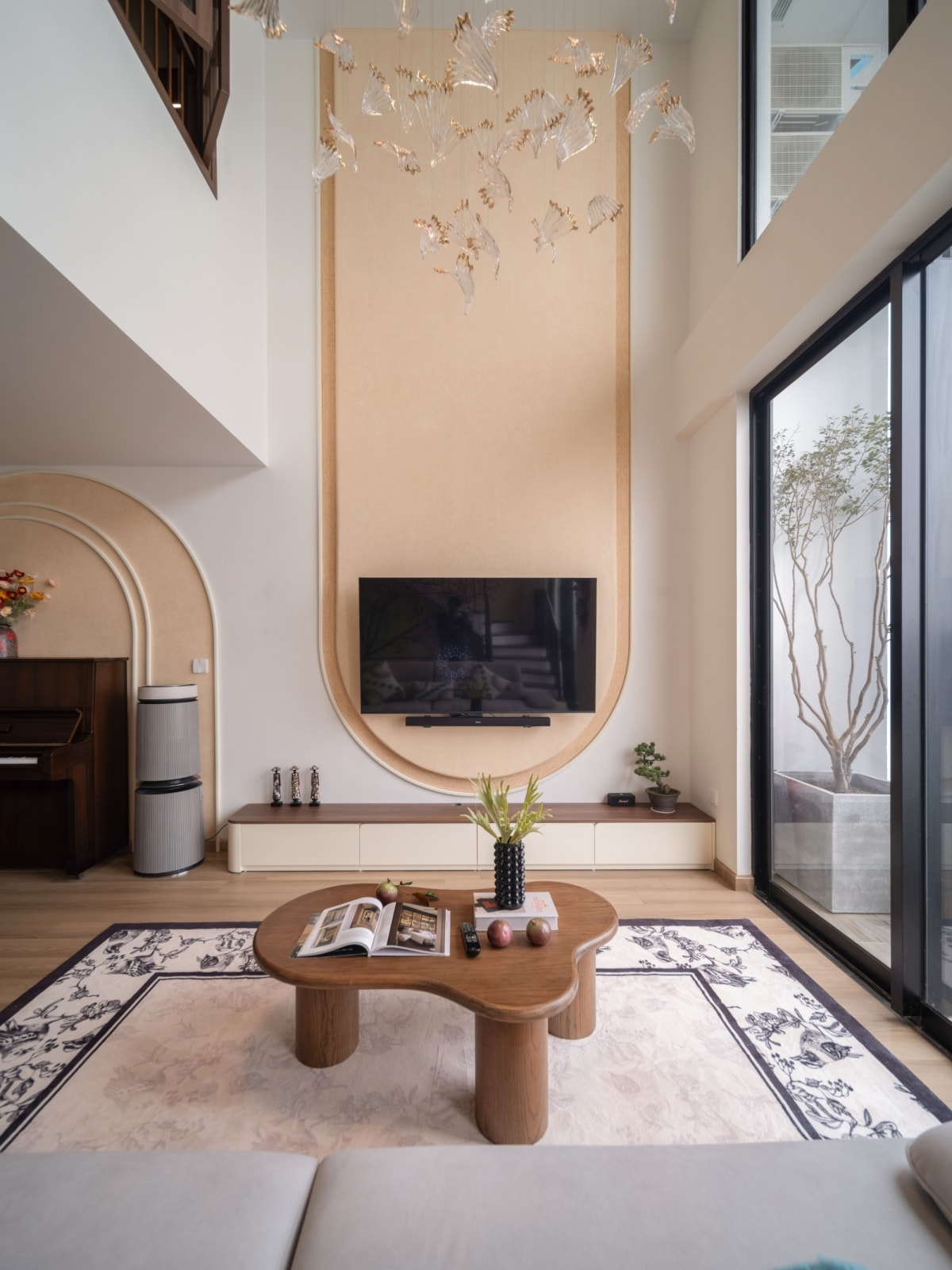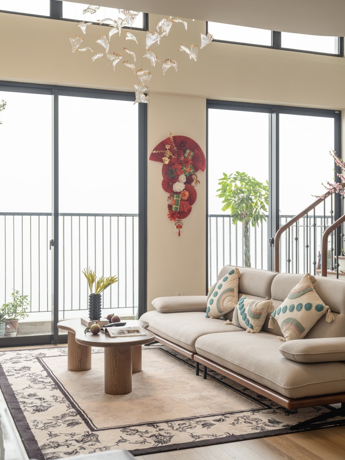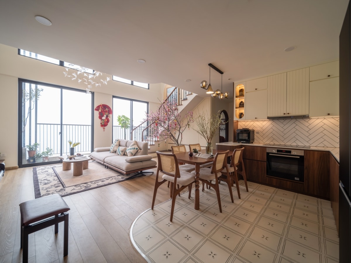 Không gian căn penthouse ưu tiên vật liệu gỗ, ánh sáng tự nhiên và bố cục liên thông giữa các khu chức năng.