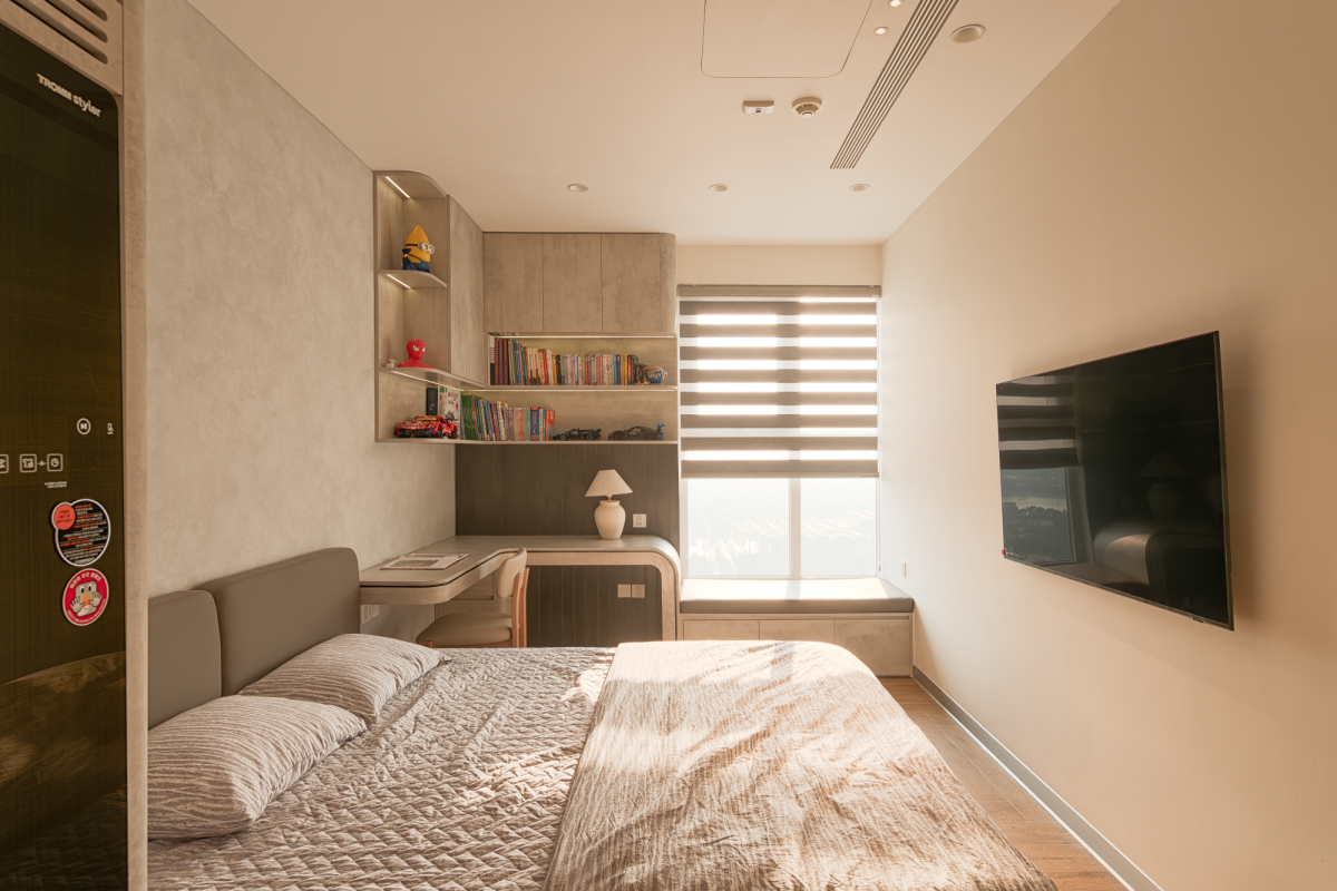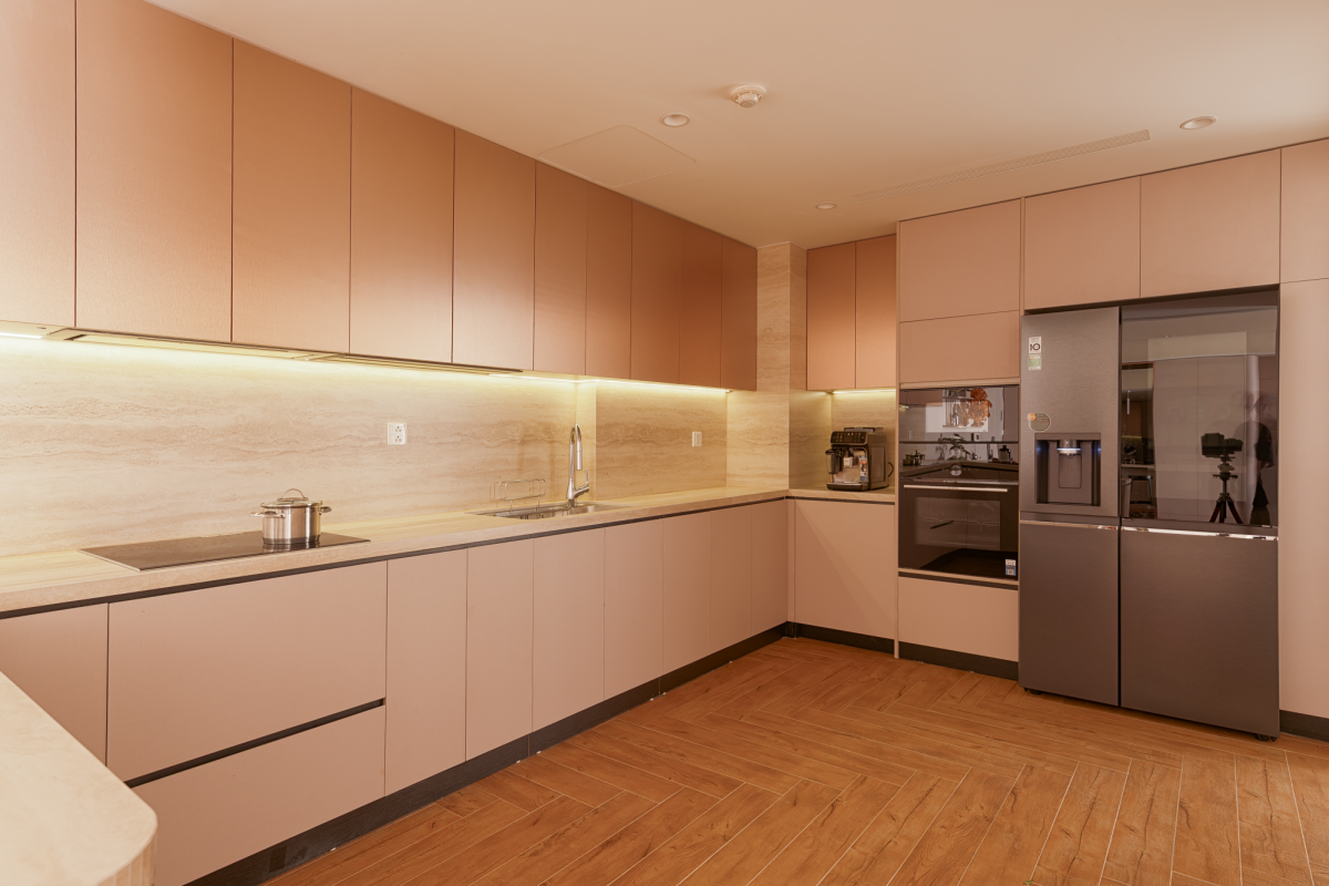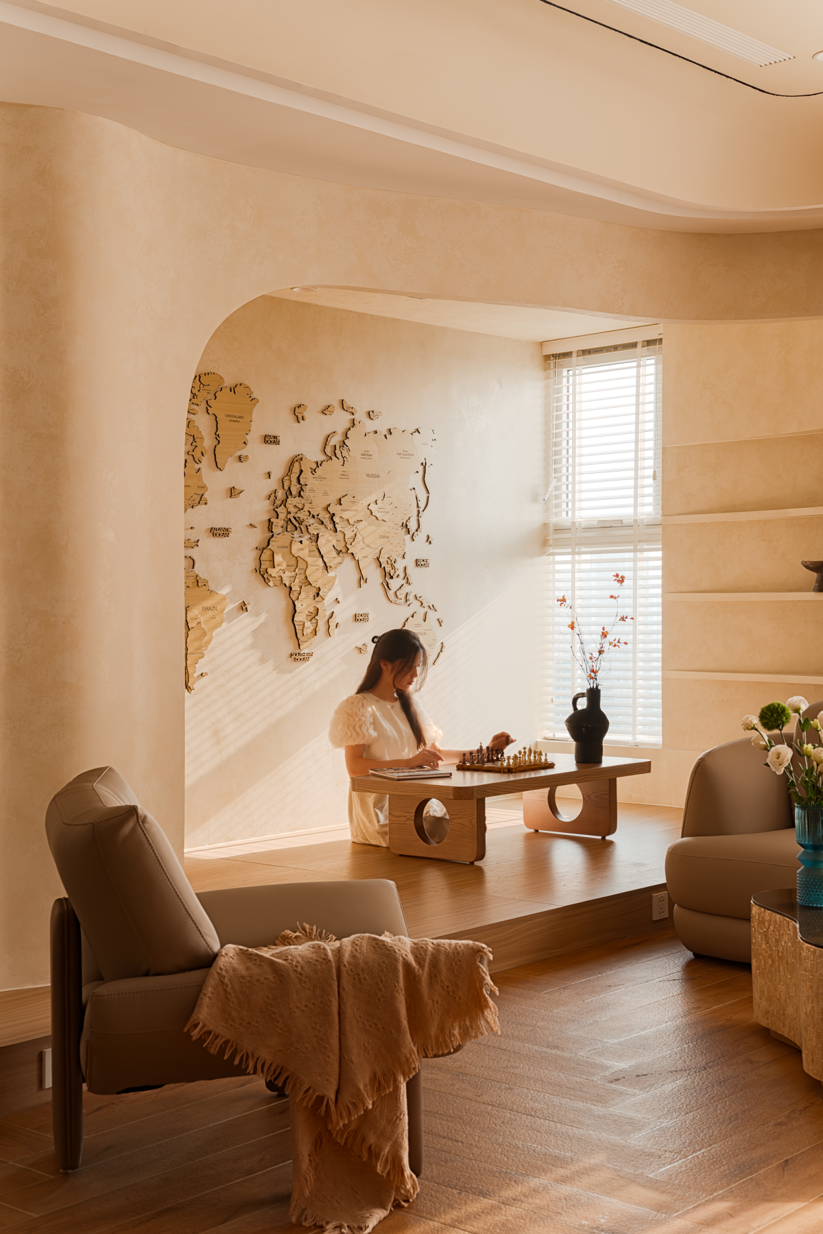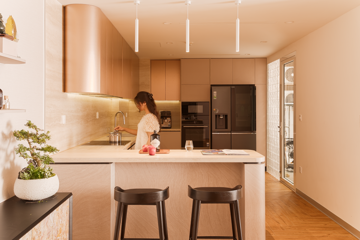 Căn hộ được cải tạo bằng việc khai thác vật liệu mới lạ làm ngôn ngữ thiết kế chủ đạo, tạo trải nghiệm sống liền mạch và có chiều sâu.