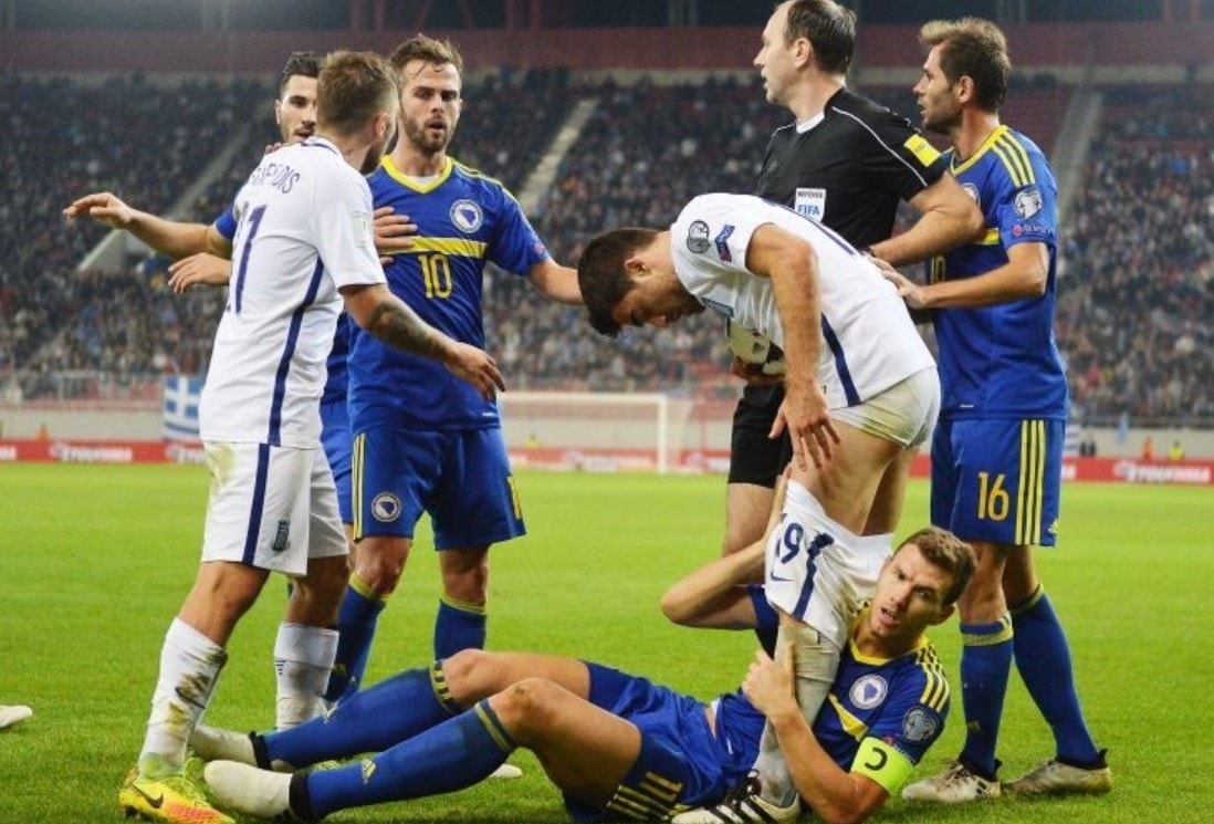Khi Sokratis giật và ôm trái bóng, Dzeko - lúc này nằm sân - đã phản ứng bằng cách tụt quần cầu thủ Hy Lạp. Hệ quả, cựu tiền đạo Man City nhận thẻ vàng thứ hai và phải rời sân. Trong thế thiếu người, Bosnia để Giorgos Tzavellas chọc thủng lưới ở phút bù giờ và bị cầm chân 1-1.