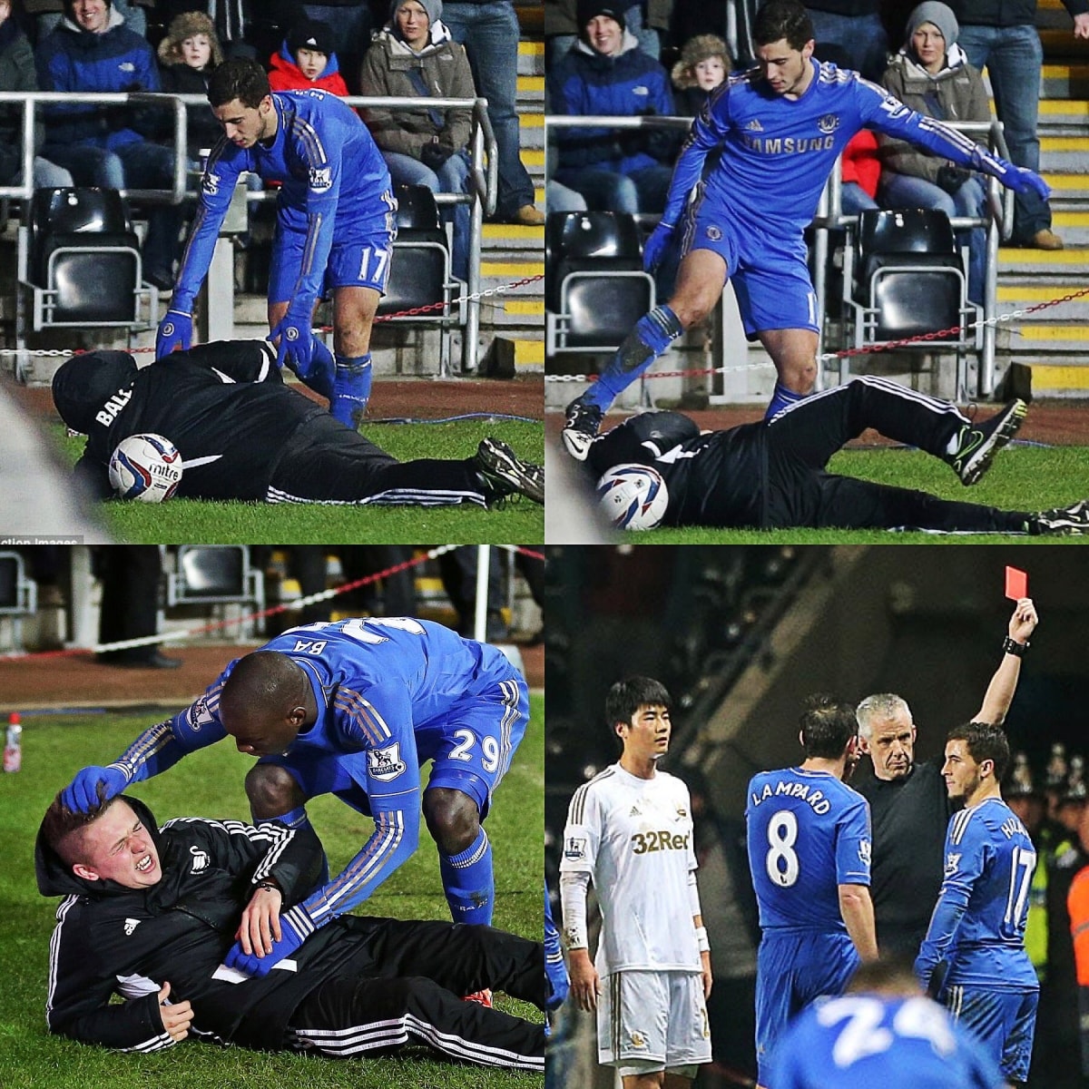 Bán kết lượt về Cup Liên đoàn Anh năm 2013 diễn ra giữa Swansea City và Chelsea. Khi đó, Chelsea đang bị dẫn 0-2 và trận đấu chỉ còn 10 phút. Chứng kiến cậu bé nhặt bóng của chủ nhà Charlie, 17 tuổi, cố giữ bóng để câu giờ, Eden Hazard tức giận đá vào người. Hệ quả, ngôi sao người Bỉ nhận thẻ đỏ trực tiếp, còn Chelsea không thể lật ngược thế cờ.