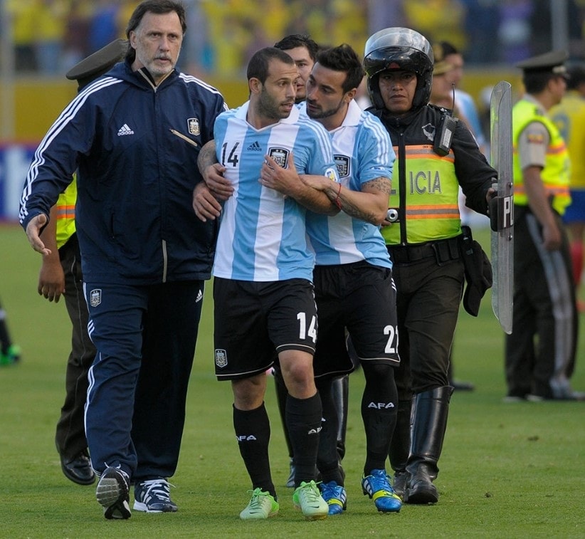 Cuối trận Argentina gặp Ecuador ở vòng loại World Cup diễn ra năm 2013, Javier Mascherano bị đau và phải rời sân trên cáng. Trong quá trình được các nhân viên y tế đưa ra ngoài, anh bị nước đổ lên người nên phản ứng bằng cách đạp liên tiếp vào một nhân viên lái xe cứu thương.