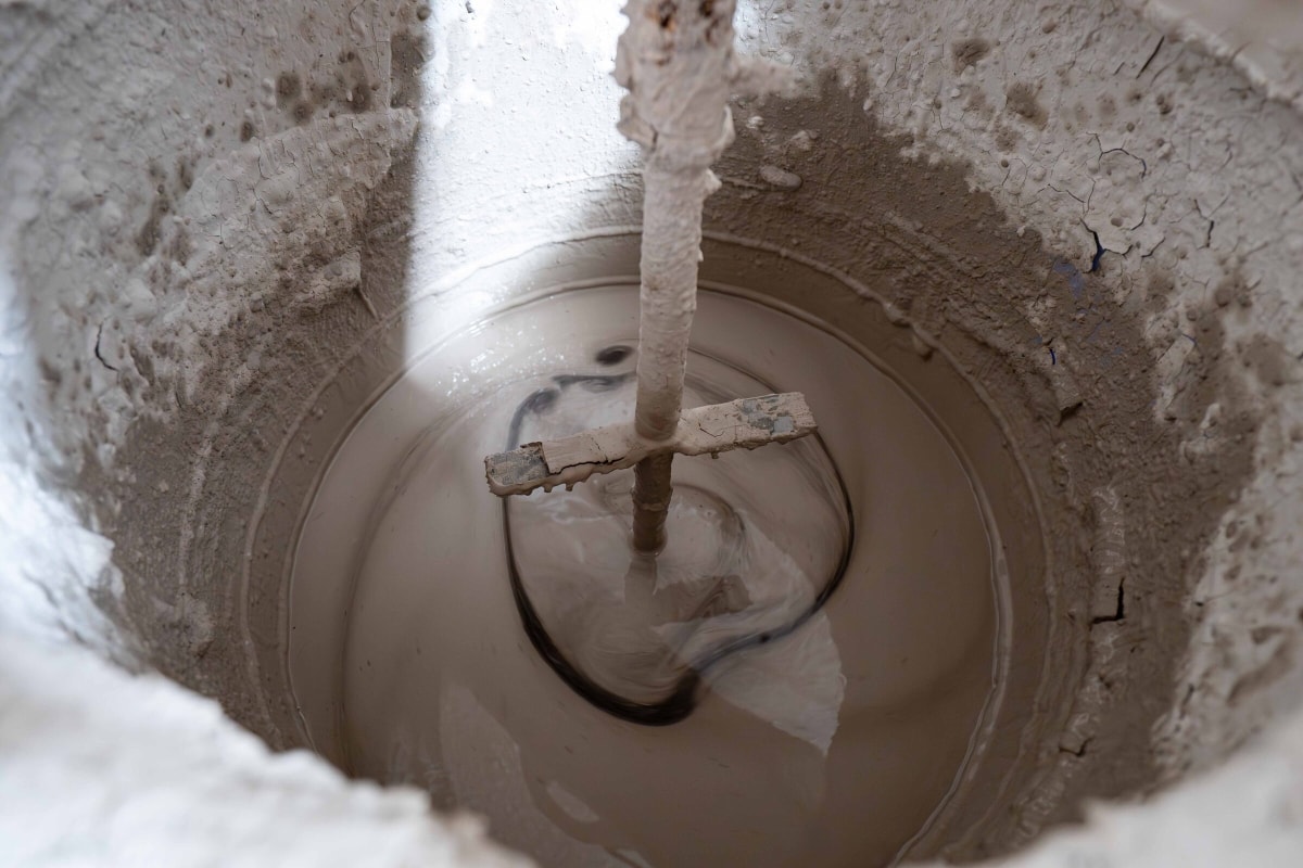 Ở công đoạn đổ khuôn, mỗi con ngựa cần khoảng 6 lít hồ nước. Trước khi đổ, khuôn được buộc chặt và cố định bằng dây thép.