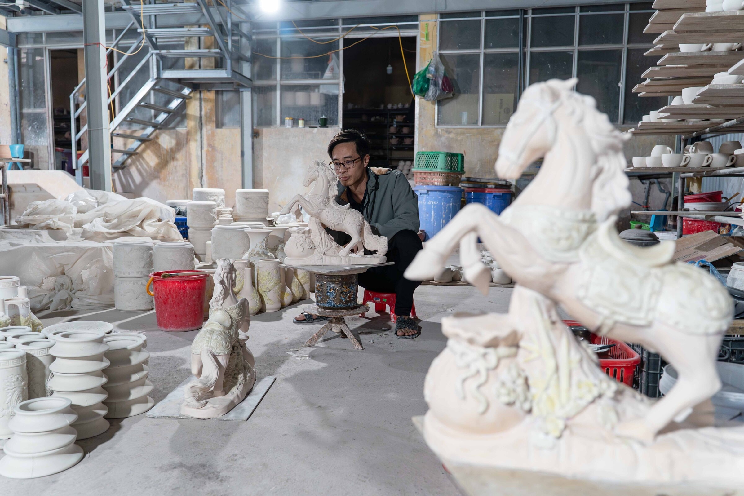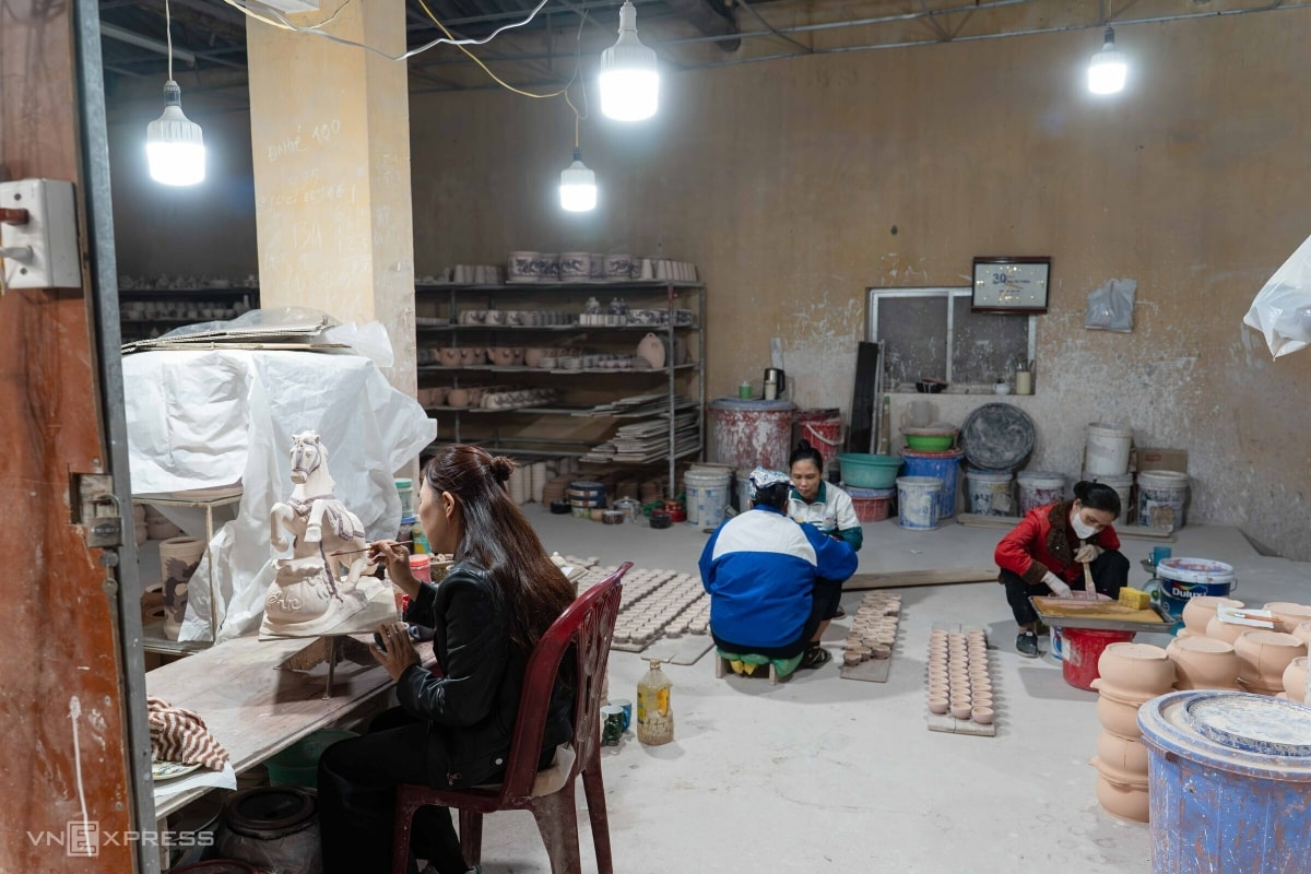 Những ngày này, xưởng sản xuất có gần 20 thợ, các thợ chính đều là người của làng nghề. Ngày thường xưởng làm đồ gốm truyền thống như bình, lọ, bát, đĩa. Gần Tết, họ chuyển sang làm linh vật. Tuy nhiên số thợ làm được ngựa không nhiều bởi phải có tay nghề cao đảm nhiệm công đoạn nhất định khi cấu thành sản phẩm.