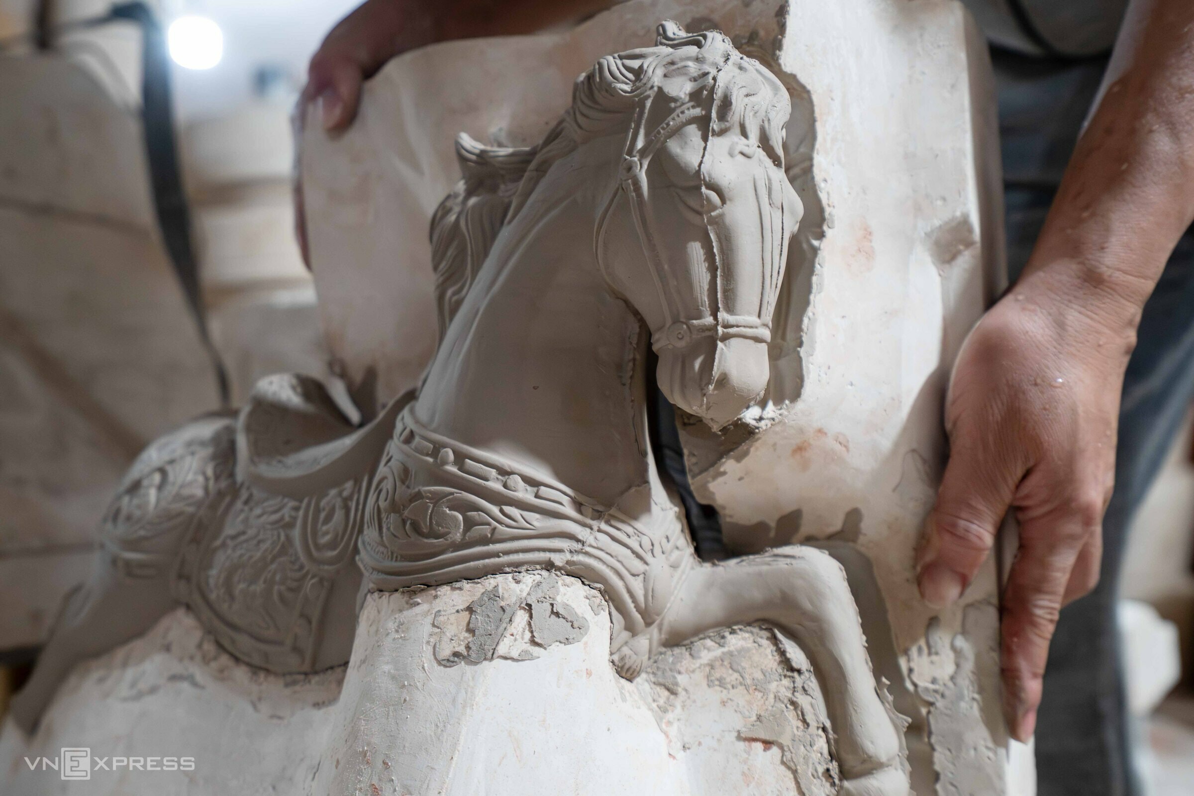 “Làm cốt vất vả nhất vì phải tạo hình hoàn toàn thủ công từ đất, mất khoảng ba tháng mới hoàn thiện một ông ngựa. Khi đã có khuôn, các công đoạn sau sẽ nhanh hơn”, ông Đỗ Quỳnh, nhân công chính tại xưởng, vừa lắp ráp khung của khuôn đúc vừa cho biết.