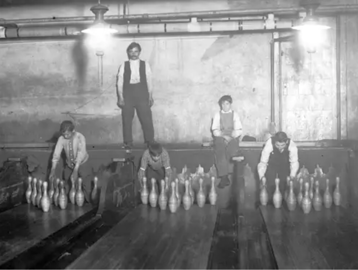 Trước khi máy xếp bóng tự động được phát minh vào năm 1936, các cậu bé thường được thuê để dựng lại những con ki (pin) bị đổ. Khi máy móc ra đời giúp tăng hiệu suất và giảm thời gian chờ, những nhân viên này vẫn được giữ lại một thời gian để bảo trì máy trước khi các dòng máy tiên tiến hơn thay thế hoàn toàn. Ảnh: Library of Congress