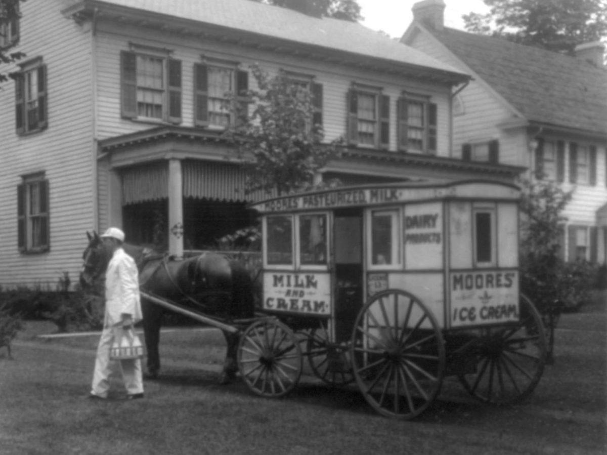 Do sữa tươi nhanh hỏng trong thời kỳ chưa có tủ lạnh, nhân viên giao sữa phải mang sản phẩm đến tận cửa từng hộ gia đình mỗi sáng. Khi tủ lạnh gia đình phổ biến, nghề này tự động biến mất, hiện chỉ còn số ít hoạt động mang tính biểu tượng tại Anh. Ảnh: Library of Congress