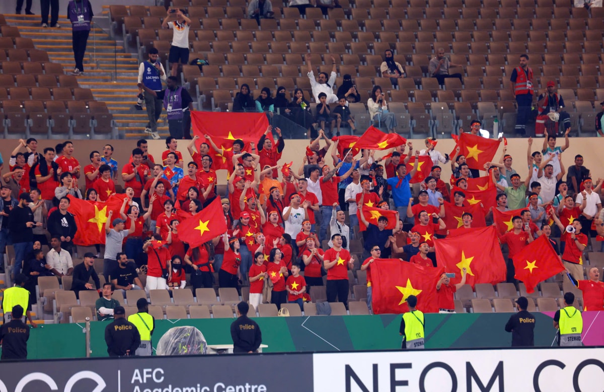 Một nhóm CĐV Việt Nam phấn khích phất cờ, hò reo trên khán đài sân Prince Abdullah Al Faisal. Các cầu thủ Việt Nam có di chuyển đến khu vực này để chia vui với nhóm người hâm mộ.
