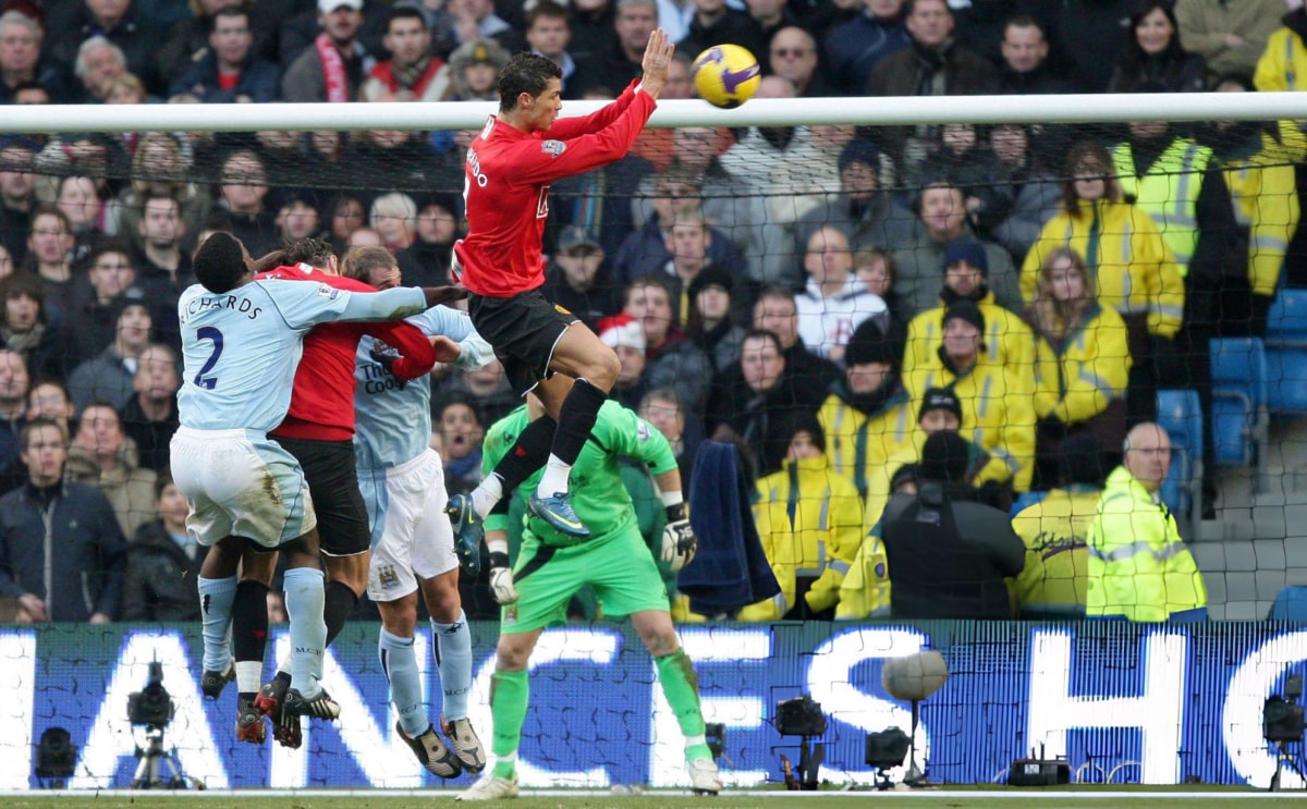 30/11/2008: Man City - Man Utd (Ngoại hạng Anh). Trong trận thắng 1-0 của Man Utd, Ronaldo bật nhảy lố đà ở một tình huống phạt góc và dùng tay đẩy bóng đi để bảo vệ khuôn mặt. Hành động tưởng chừng vô hại ấy dẫn tới tấm thẻ vàng thứ hai của chân sút người Bồ Đào Nha.
