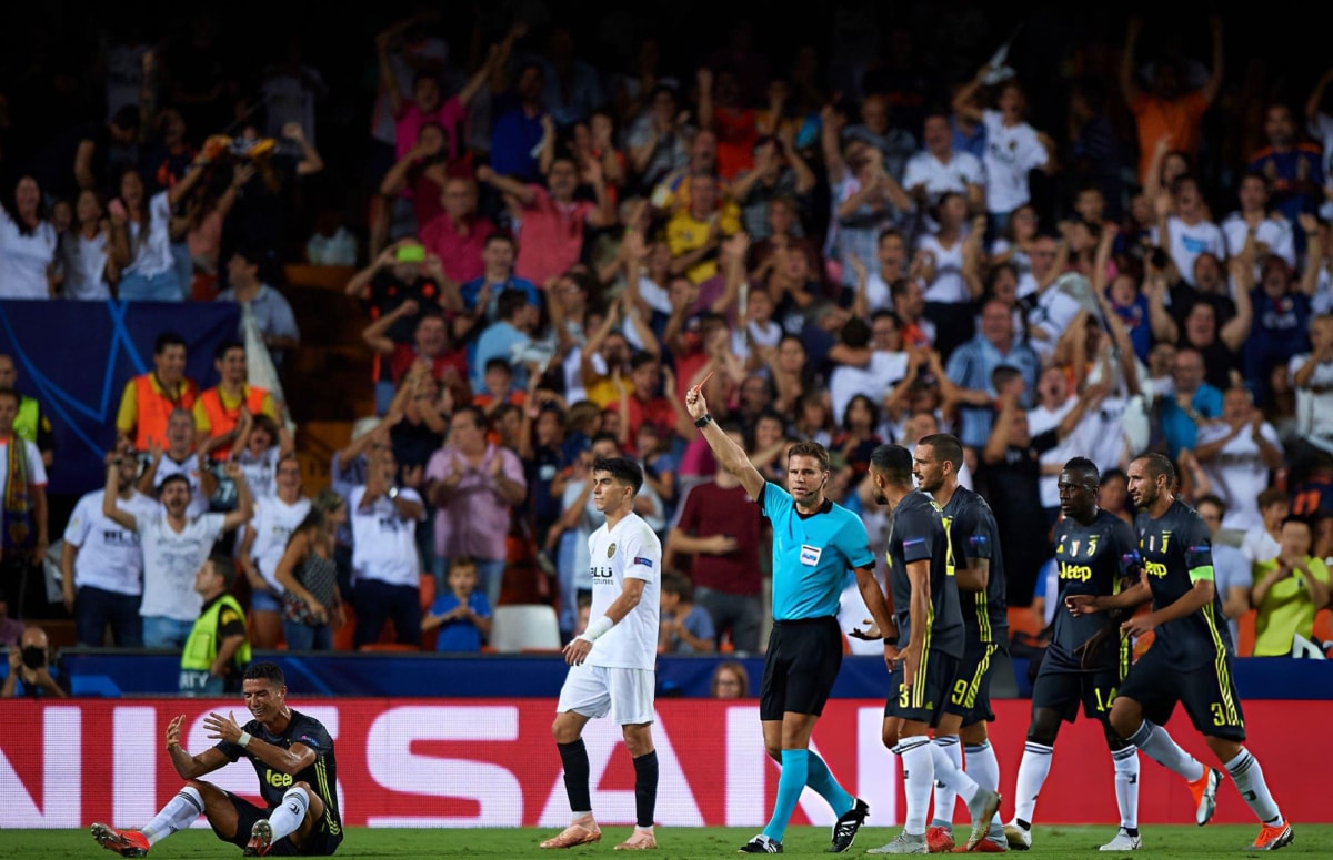 19/9/2018: Valencia - Juventus (vòng bảng Champions League). Trong thời gian khoác áo Juventus, Ronaldo dính một thẻ đỏ duy nhất, ở thắng lợi 2-0 trước Valencia tại vòng bảng Champions League.