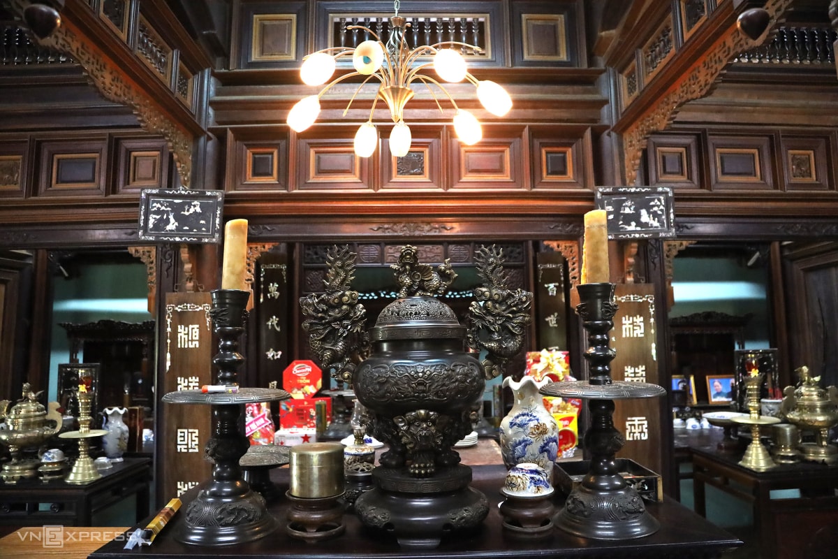 Án thờ, đèn, lư đồng, bình bát bằng sứ, lọng, hoành phi và liễn chữ Hán được trưng bày ở khu vực trong nhà.