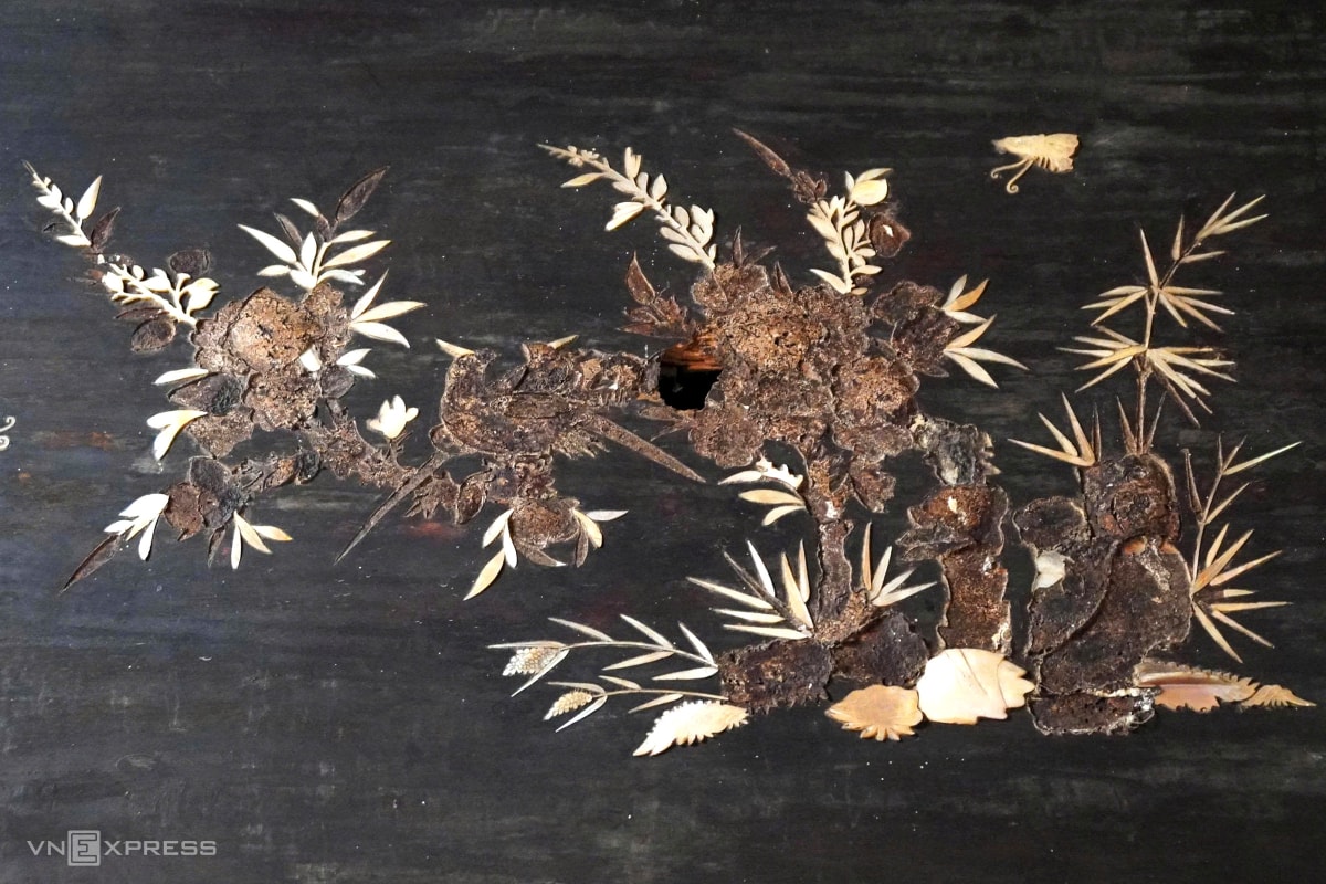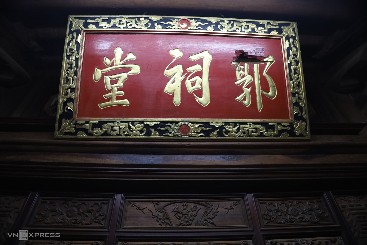 Bức hoành phi dòng chữ Hán (Quách Từ Đường) thủng một vết do chiến tranh.