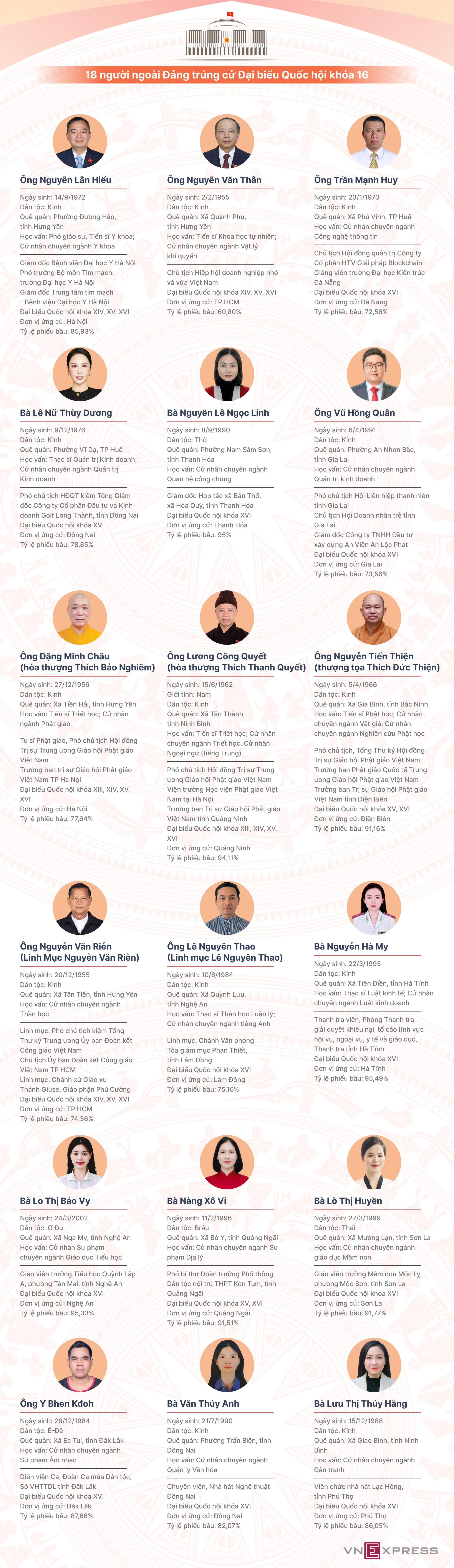 Trong số 18 người ngoài Đảng trúng cử Đại biểu Quốc hội khóa 16 có PGS Nguyễn Lân Hiếu, 5 doanh nhân, 3 lãnh đạo Giáo hội Phật giáo Việt Nam và 2 linh mục Công giáo.