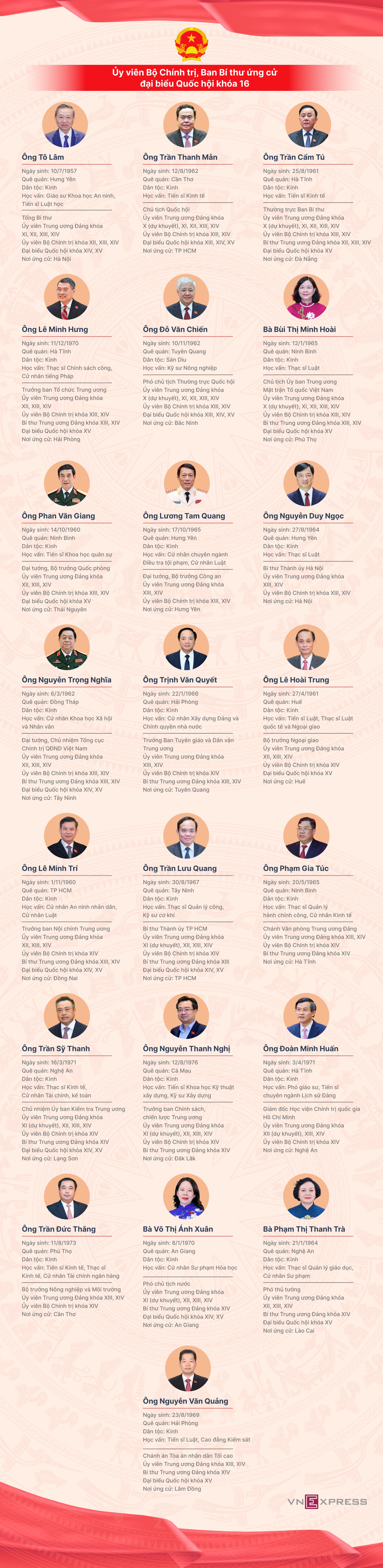 Trong 864 ứng viên đại biểu Quốc hội khóa 16 có 22 Ủy viên Bộ Chính trị và Ban Bí thư tham gia ứng cử tại nhiều tỉnh thành, theo cơ cấu Trung ương giới thiệu.