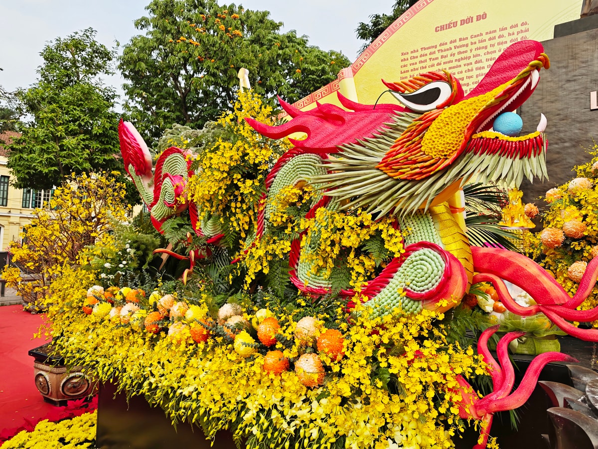 Dưới chân tượng đài Lý Thái Tổ đặt hai con rồng kết từ hàng nghìn bông hoa xanh, vàng, đỏ, tạo thế rồng chầu.