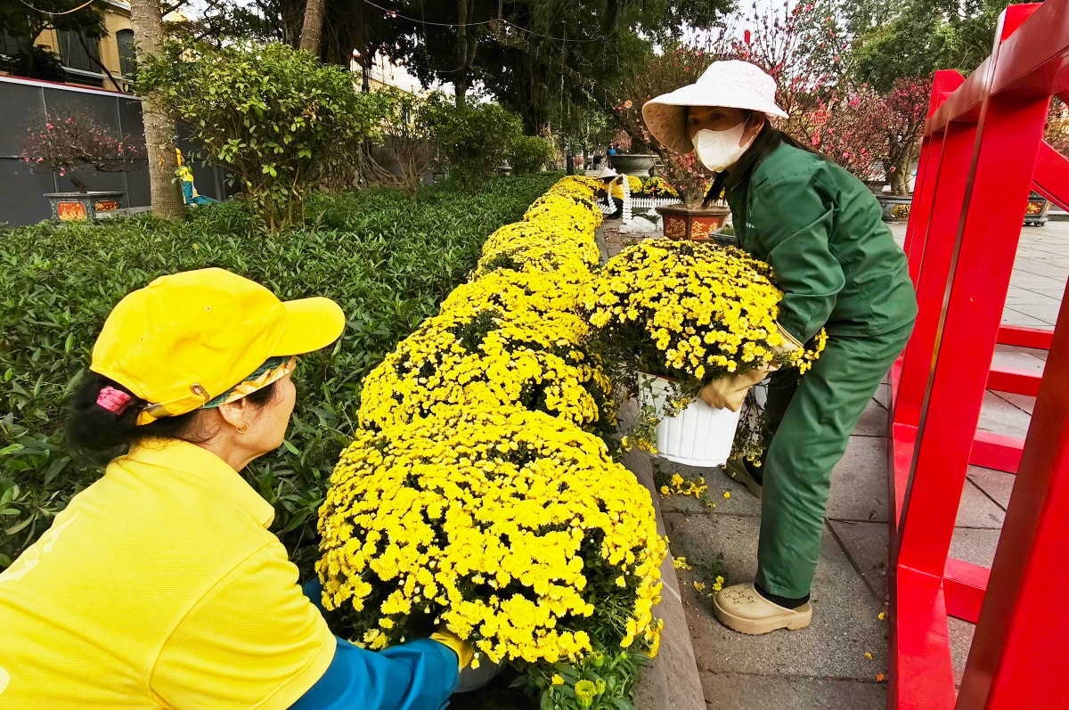 Hàng trăm chậu cúc vàng Sa Đéc được bố trí dọc các đường cong trong vườn hoa, sẵn sàng thay thế khi gặp thời tiết khắc nghiệt tại Thủ đô.