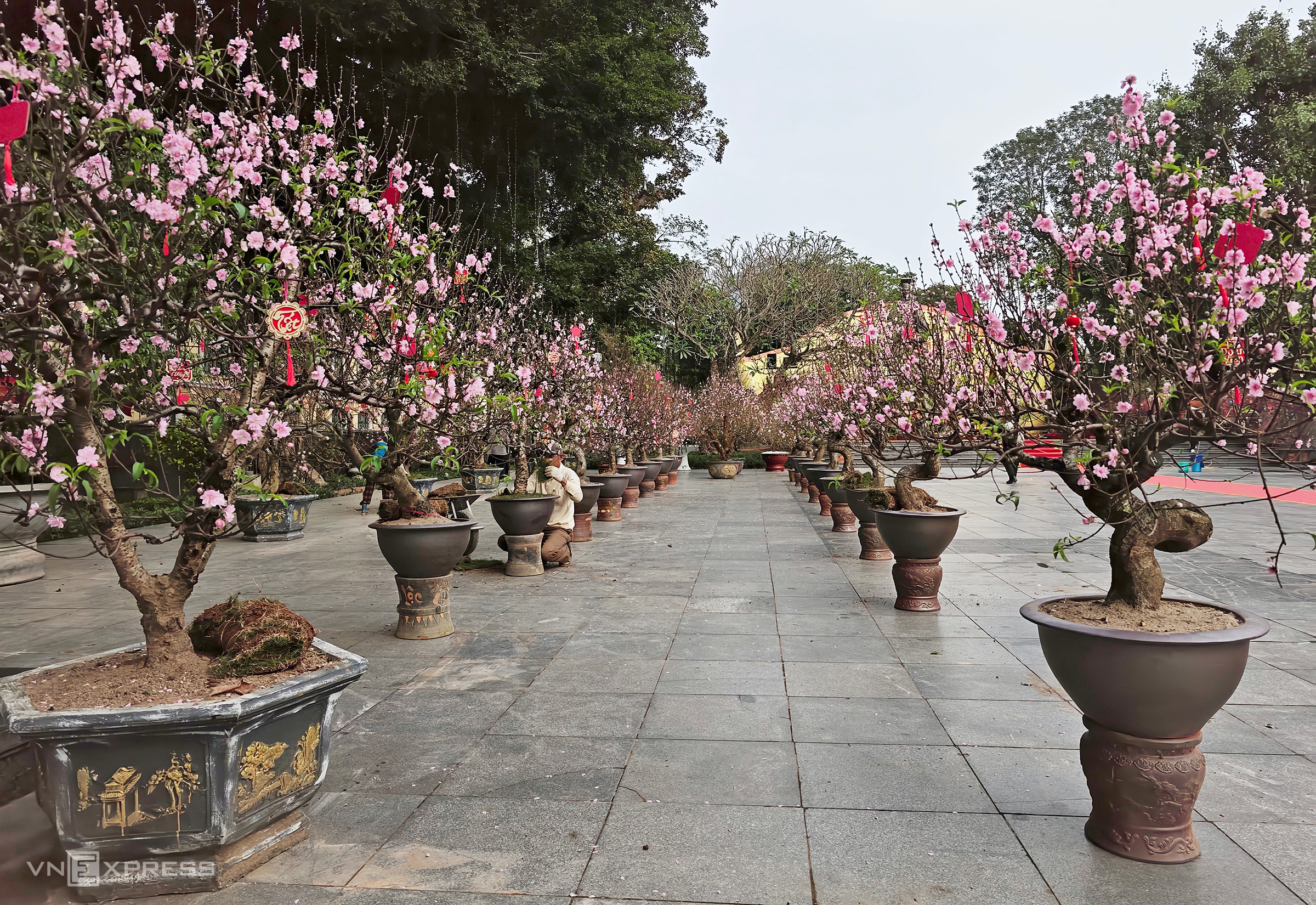 Xung quanh vườn hoa và sân trước tượng đài Lý Thái Tổ đặt hàng trăm chậu đào đường kính gốc 10 cm, tạo thế bonsai.