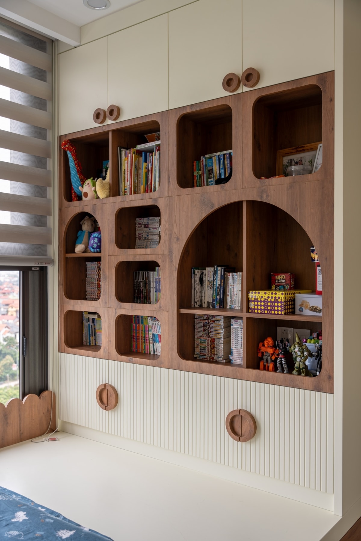 Hệ kệ mở và hộc kín để phân loại sách, đồ chơi trong phòng trẻ em. Ngăn giữa tạo hình vòng cung, vừa bắt mắt lại vừa chia tách công năng sử dụng.