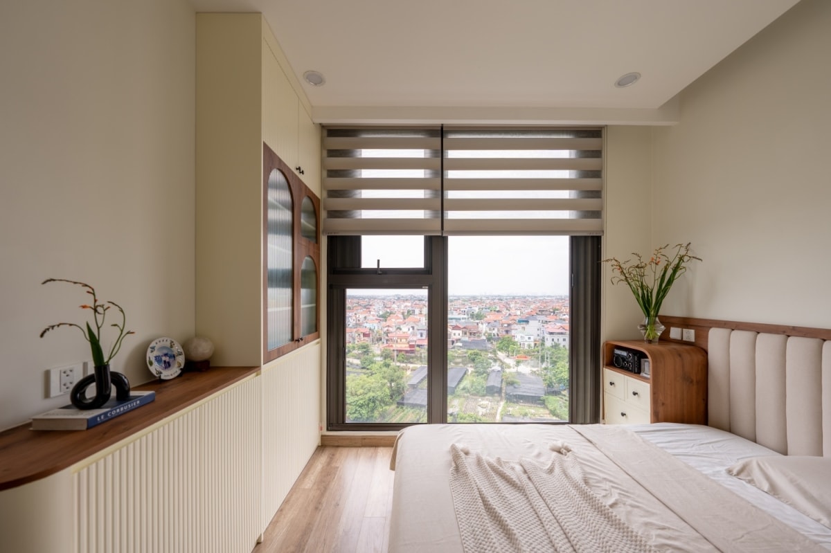 Phòng ngủ còn lại dành cho ông bà, thiết kế đơn giản với giường thấp, hệ tủ kịch trần.