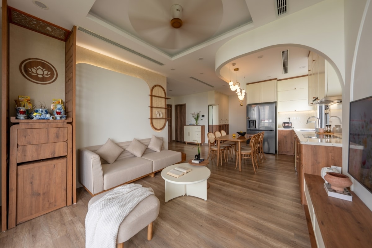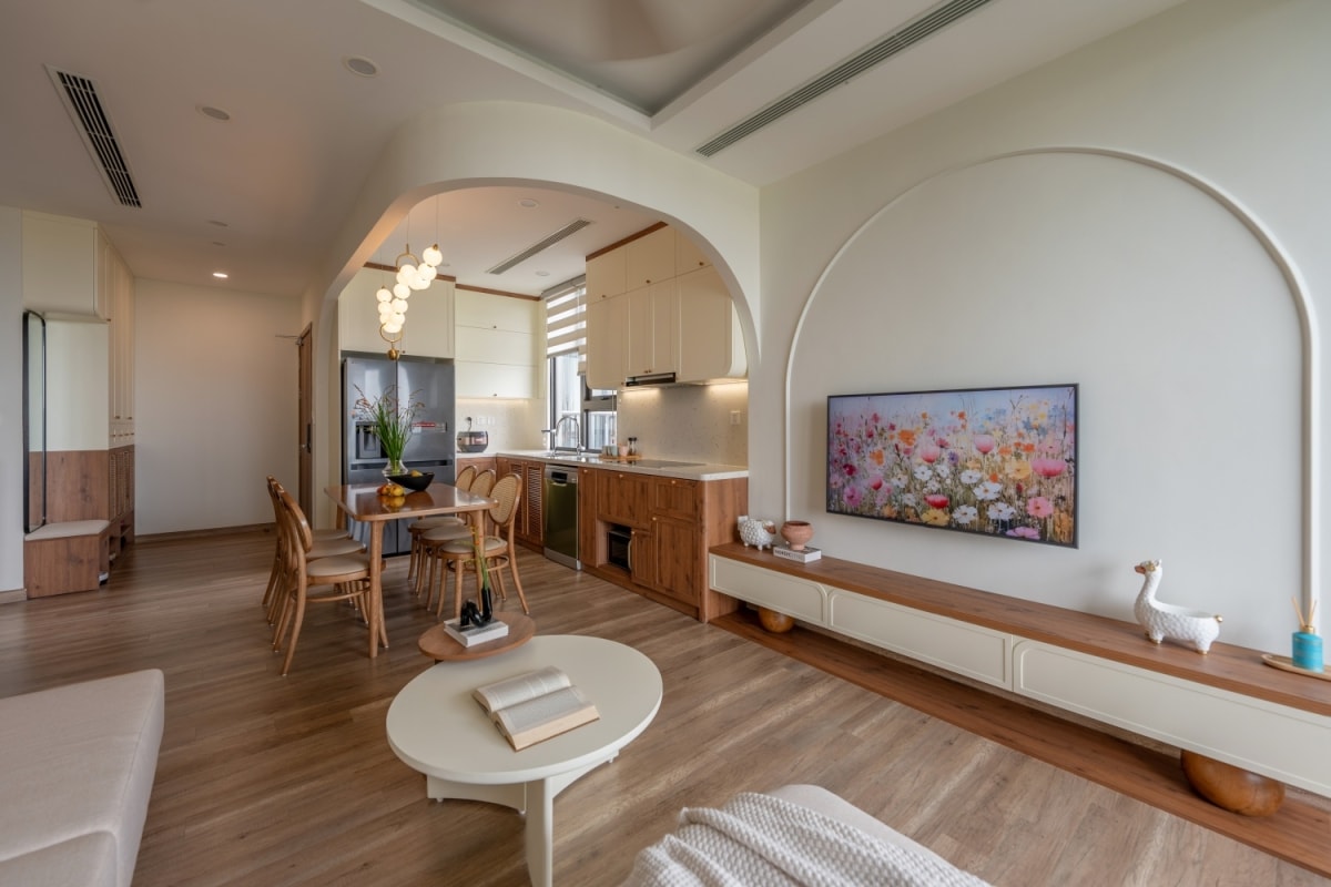 Các chi tiết bo cong ở tủ bếp, vách trang trí hay nội thất được thiết kế đồng bộ, đảm bảo an toàn sử dụng, đồng thời gợi sự mềm mại đặc trưng của Wabi-sabi. Bên cạnh đó, hệ nội thất ưu tiên tính tiện dụng cũng đúng tinh thần "đủ dùng" của phong cách này.