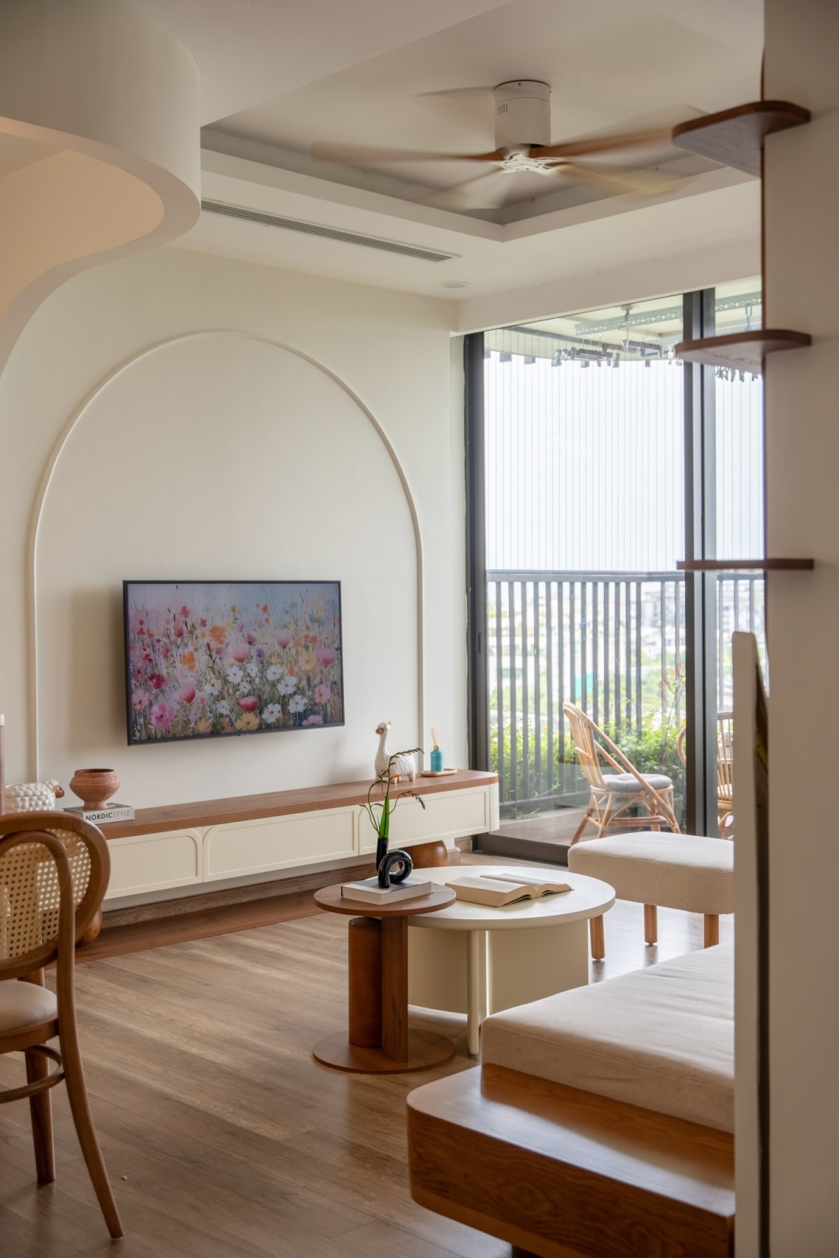 Tường sau tivi được thiết kế với khung vòm, đồng bộ với đường bo cong của trần nhà và bàn trà.