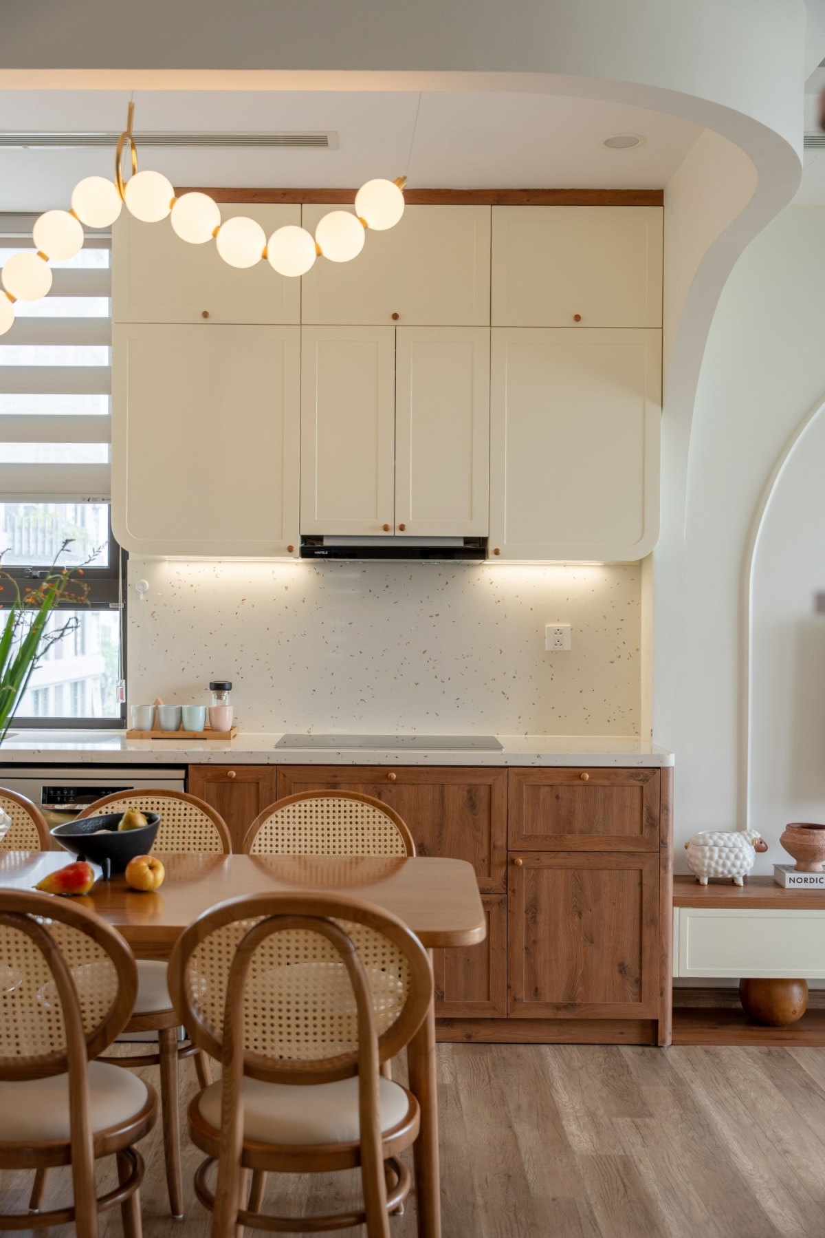 Tủ bếp sử dụng hai tông màu chủ đạo là trắng và gỗ, đi cùng mặt đá terrazzo. Toàn bộ tủ trên được thiết kế kịch trần, tăng không gian lưu trữ. Đèn trần treo hình chuỗi hạt tròn, bổ sung thêm chất thơ cho khu vực bếp ăn.