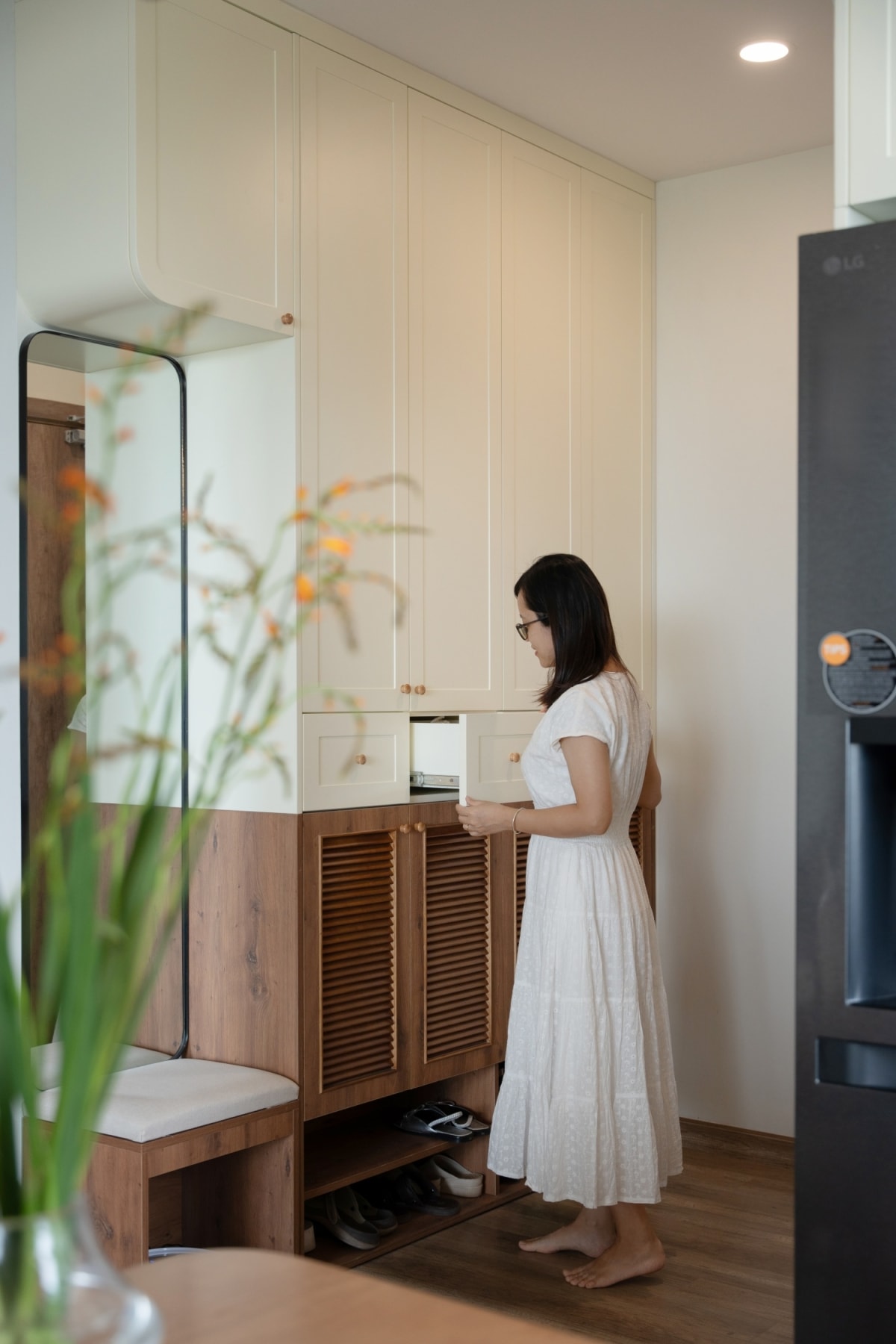 Hệ tủ đựng đồ và tủ giày với ngăn trên kín, ngăn giữa cánh chớp và khoang dưới để giày sử dụng hàng ngày. Thiết kế tích hợp ghế ngồi bọc nệm và gương lớn, hỗ trợ mọi người thao tác dễ dàng trước khi ra ngoài.