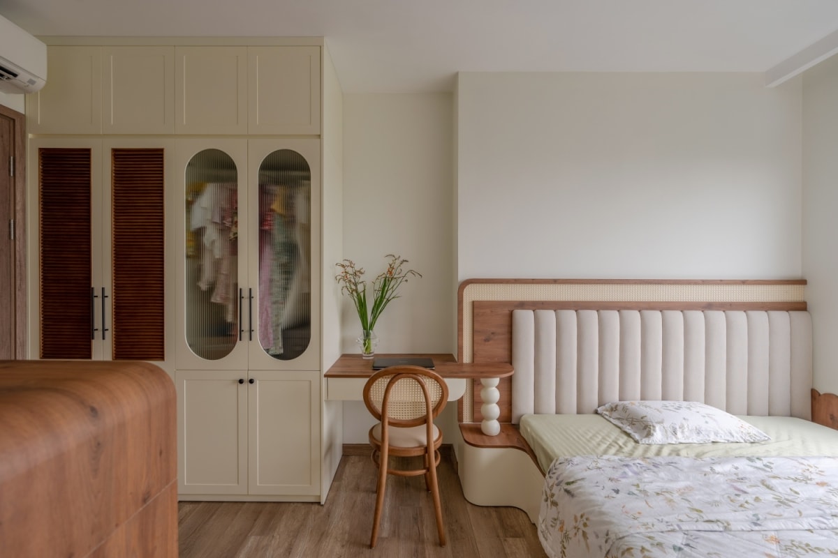 Phòng ngủ phụ dành cho con nhỏ được kết hợp bàn học, tủ và kệ để đồ. Các chi tiết bo tròn được lặp lại, tạo sự an toàn cho trẻ nhỏ. Giường hướng ra cửa kính, giúp mở rộng không gian.