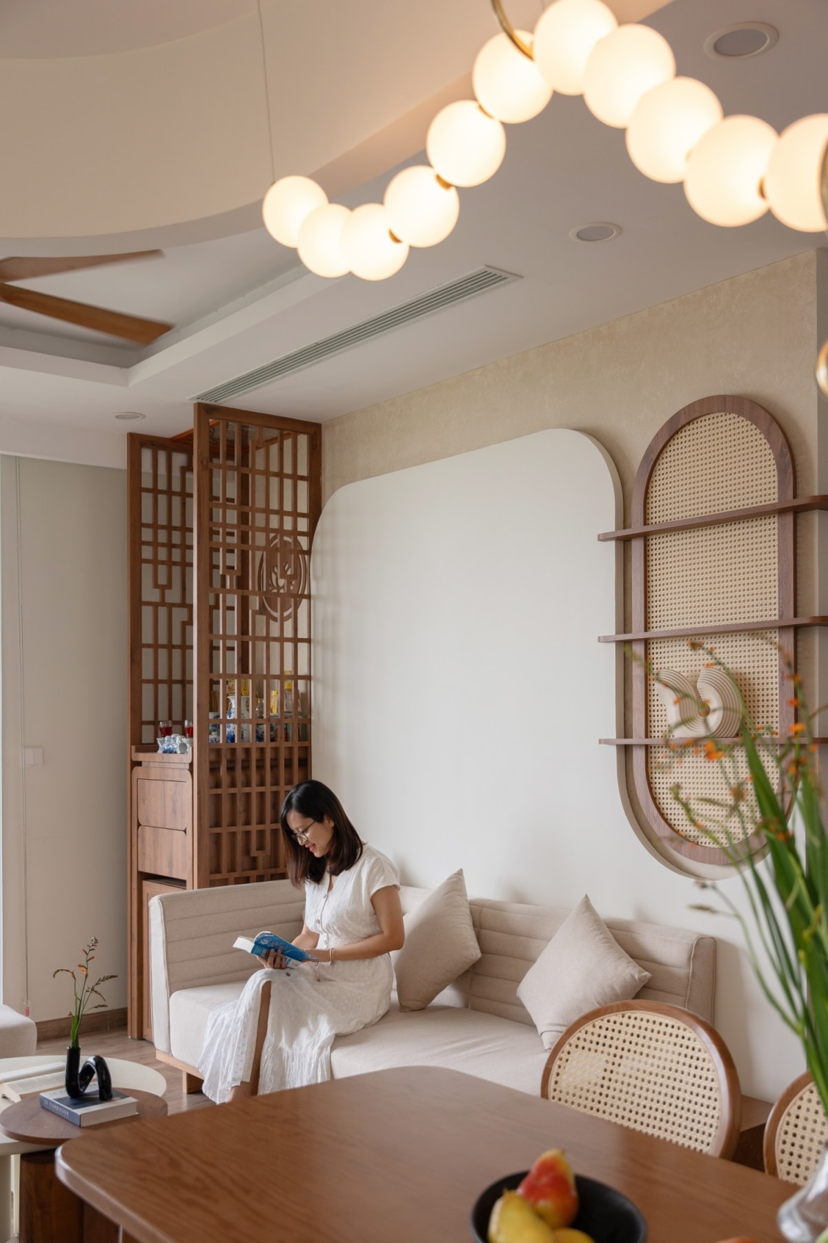 Không gian sống là sự kết hợp chất liệu tự nhiên với đường cong uốn mềm, mang lại cảm giác thoải mái cho gia đình ba thế hệ.