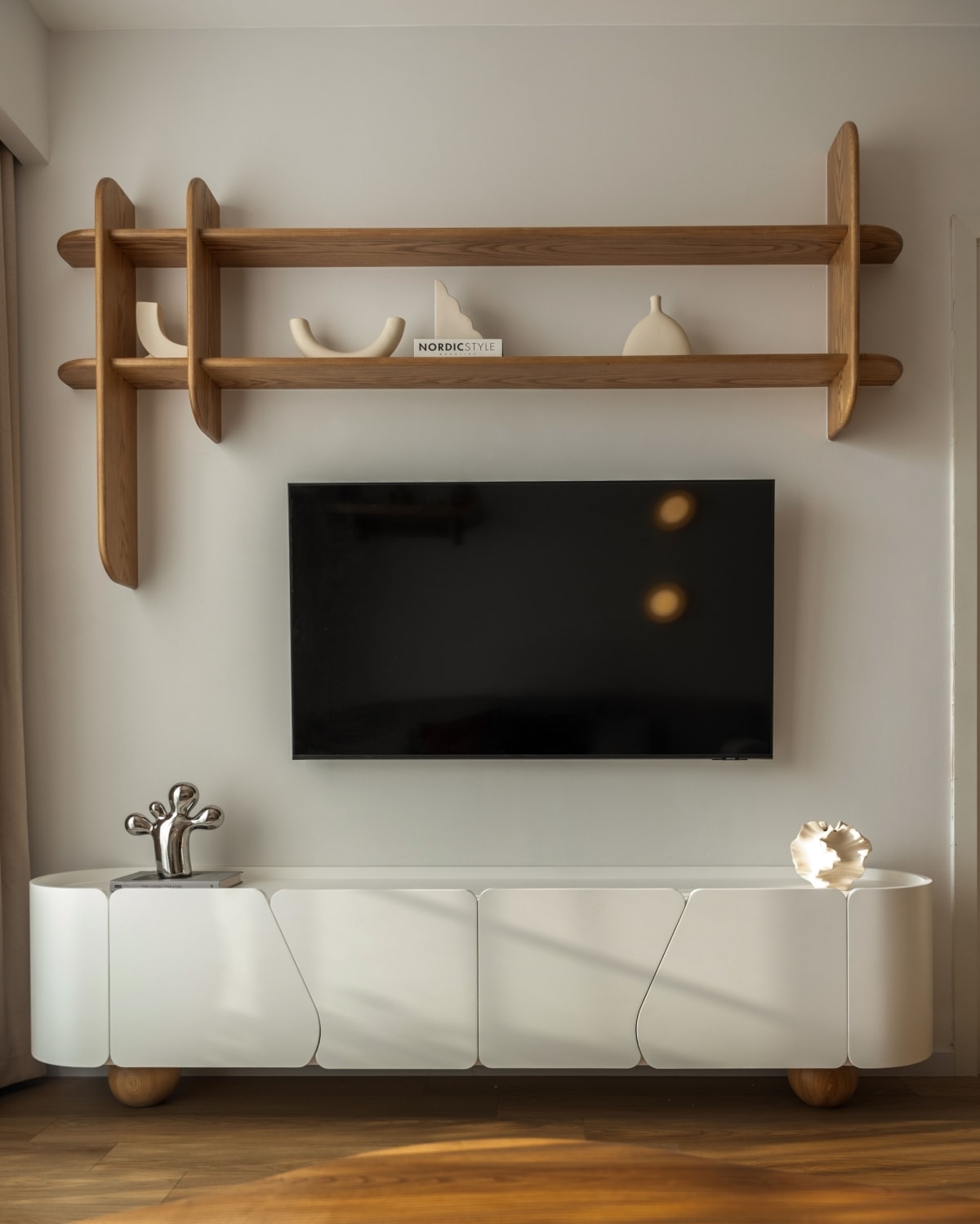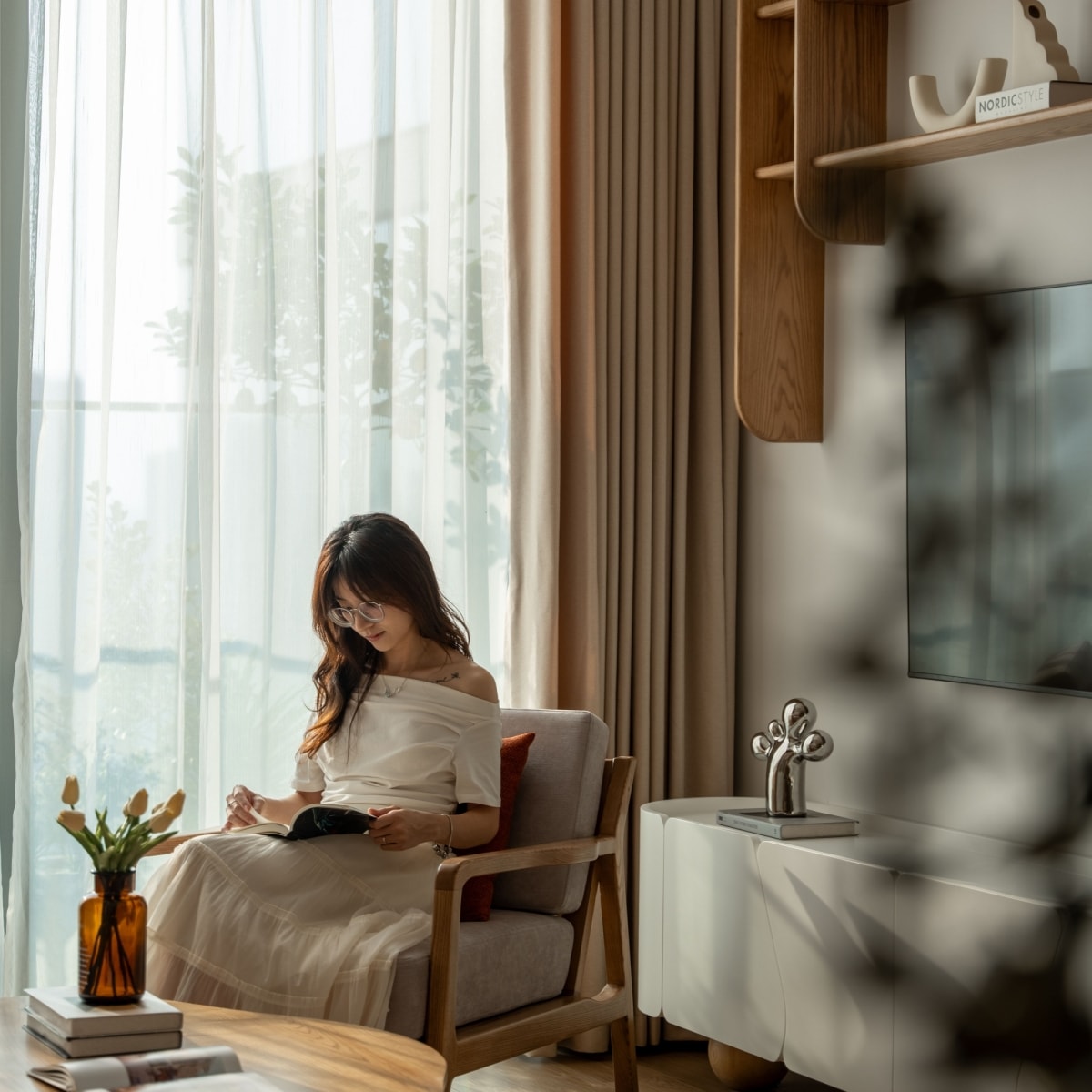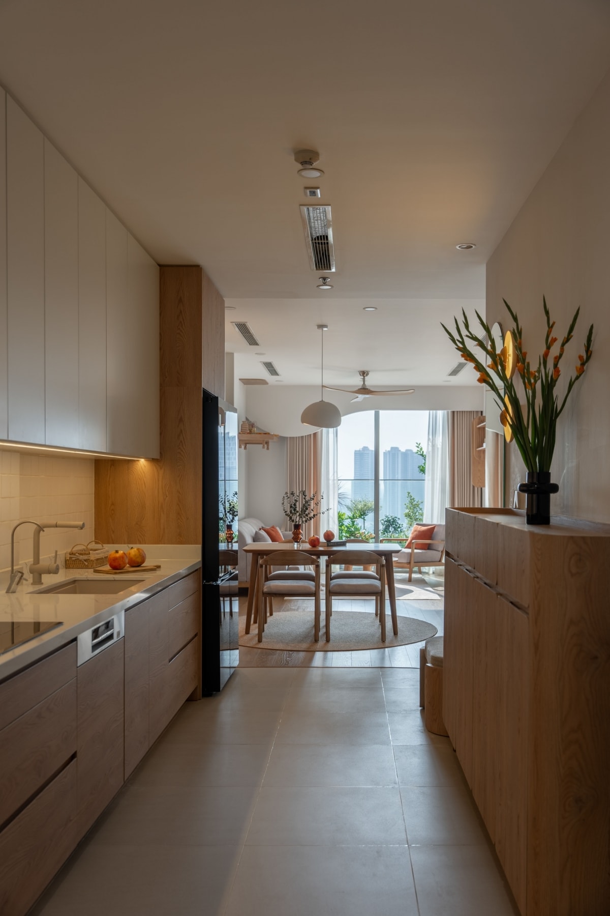 Căn hộ được thiết kế theo phong cách hiện đại, kết hợp vật liệu gỗ, ánh sáng và tối ưu không gian sống.