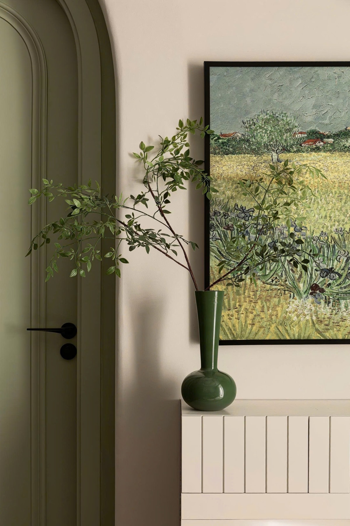 Căn hộ sử dụng bảng màu xanh bơ và kem làm chủ đạo, kết hợp đường cong, ánh sáng tự nhiên để tạo nên không gian sống thư giãn.