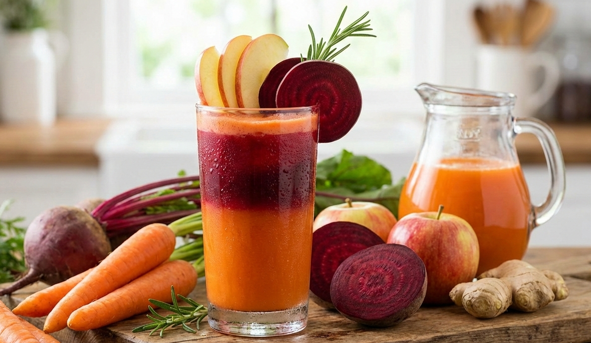 Nước ép cà rốt, củ dền và táo giàu beta carotene - chất được chuyển hóa thành vitamin A, quan trọng cho sức khỏe mắt. Thường xuyên uống loại nước ép này còn bổ sung lutein và zeaxanthin, hỗ trợ bảo vệ hoàng điểm và võng mạc.