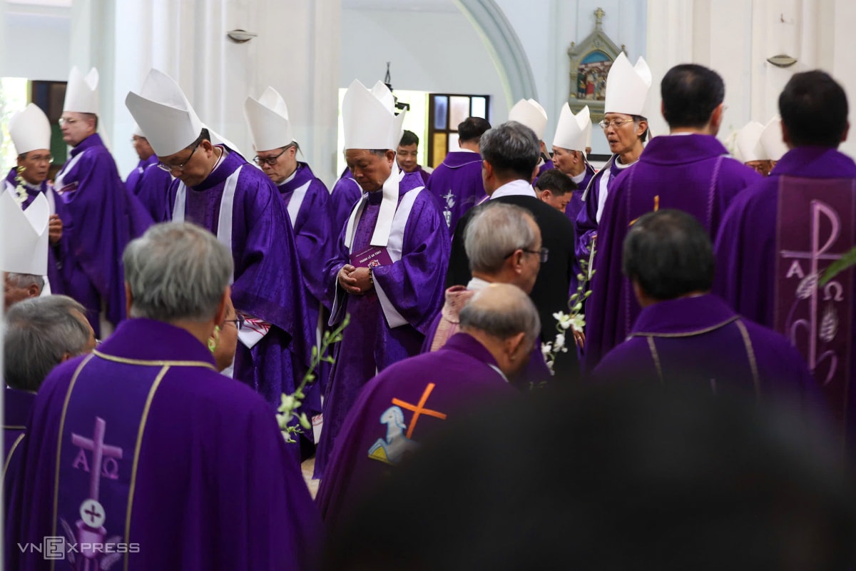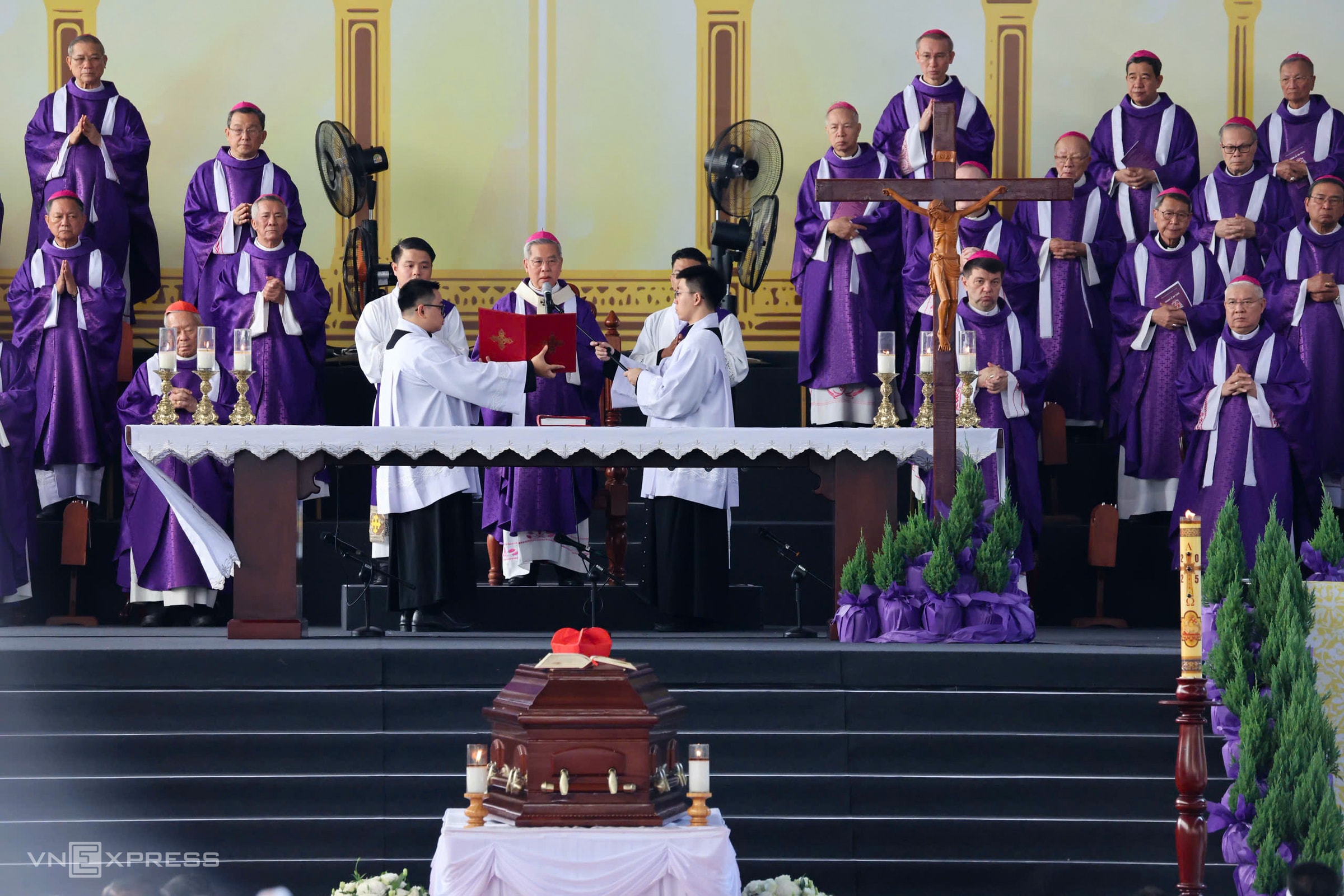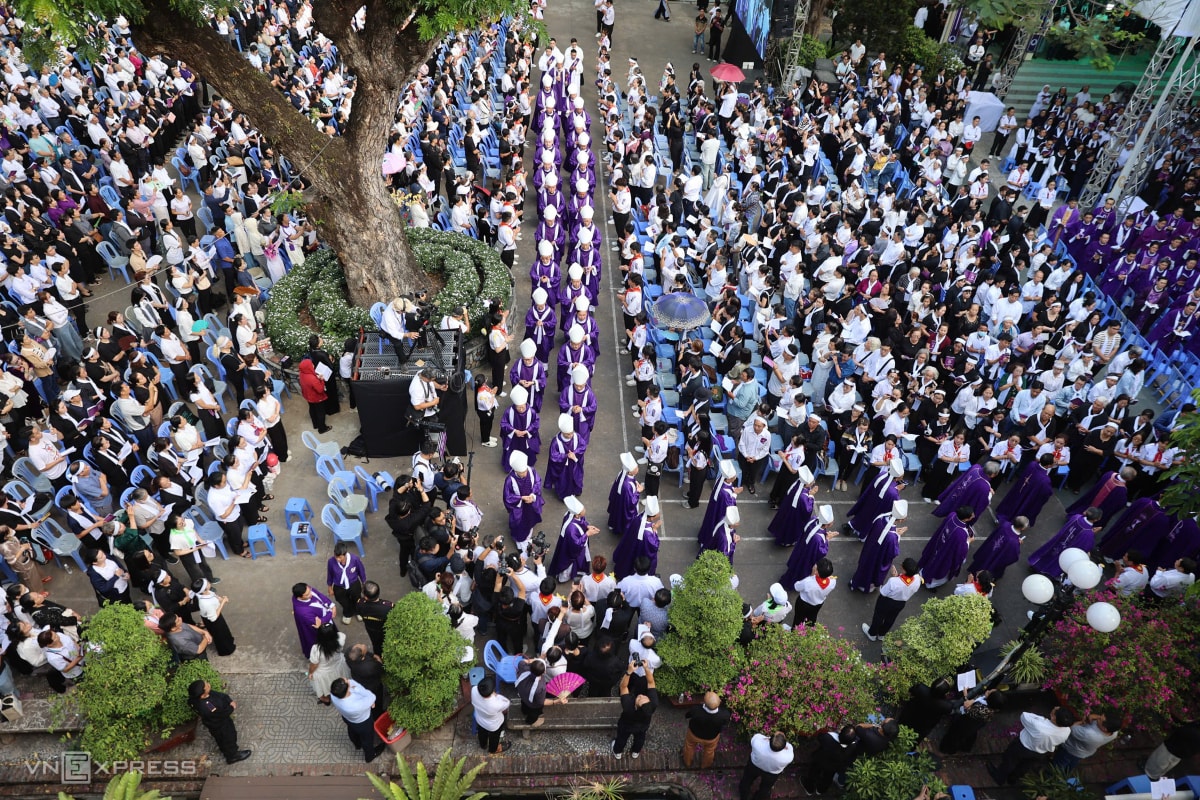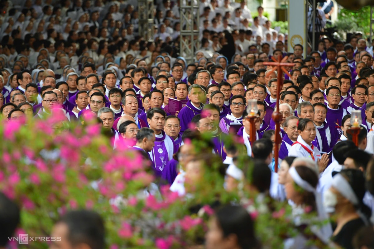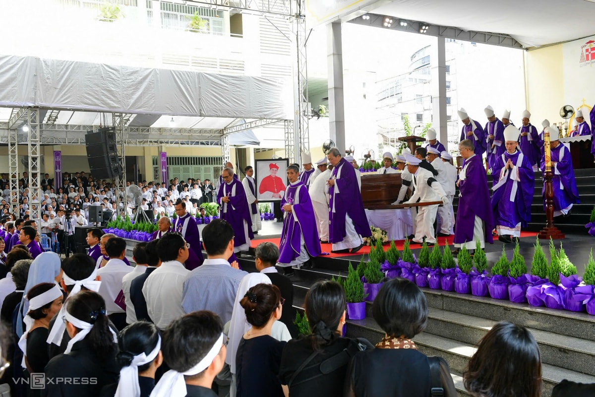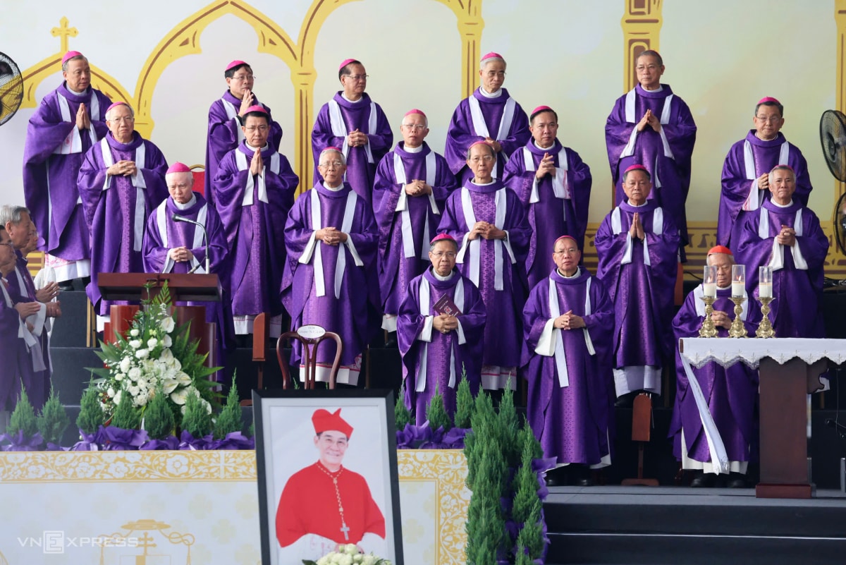 Theo Ban tổ chức tang lễ, có hơn 500 linh mục, giám mục cử hành thánh lễ. Trong bộ phẩm phục màu tím, các cha đồng tế cầu nguyện cho cố Đức Hồng y. Theo nghi lễ Công giáo, màu tím và màu đen là hai màu chủ đạo khi cử hành tang lễ.