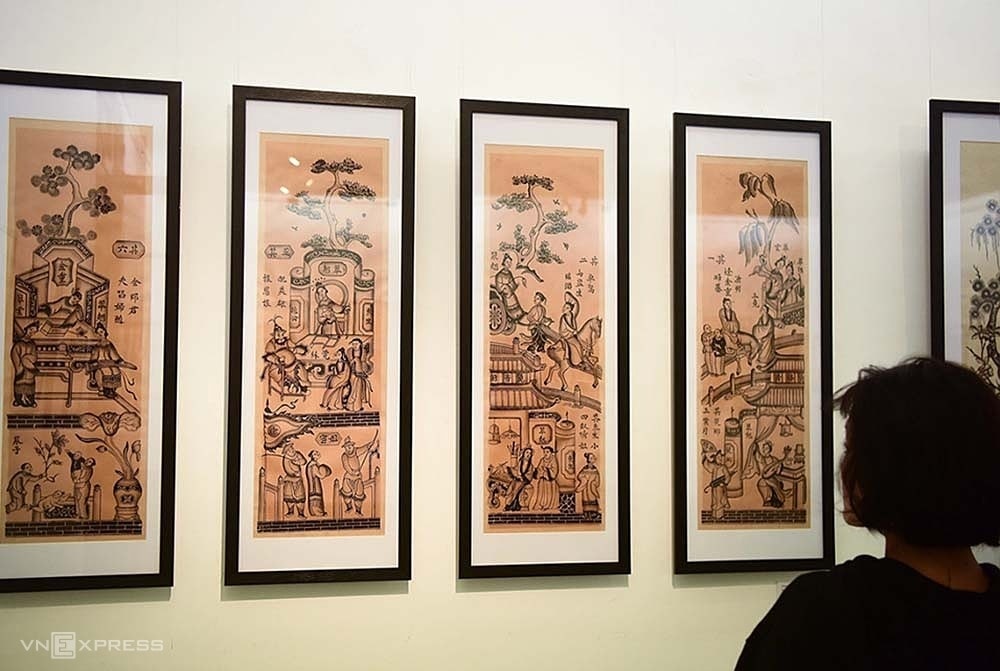 Du khách đang đứng xem các bức tranh Đông Hồ tại bảo tàng Mỹ thuật Việt Nam năm 2019. Ảnh: Giang Huy