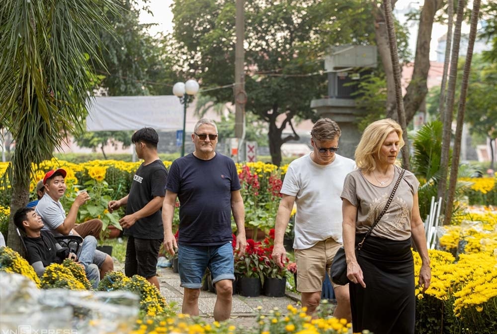 Du khách đi tham quan chợ hoa tại công viên 23/9, gần chợ Bến Thành, TP HCM. Ảnh: Khương Nguyễn