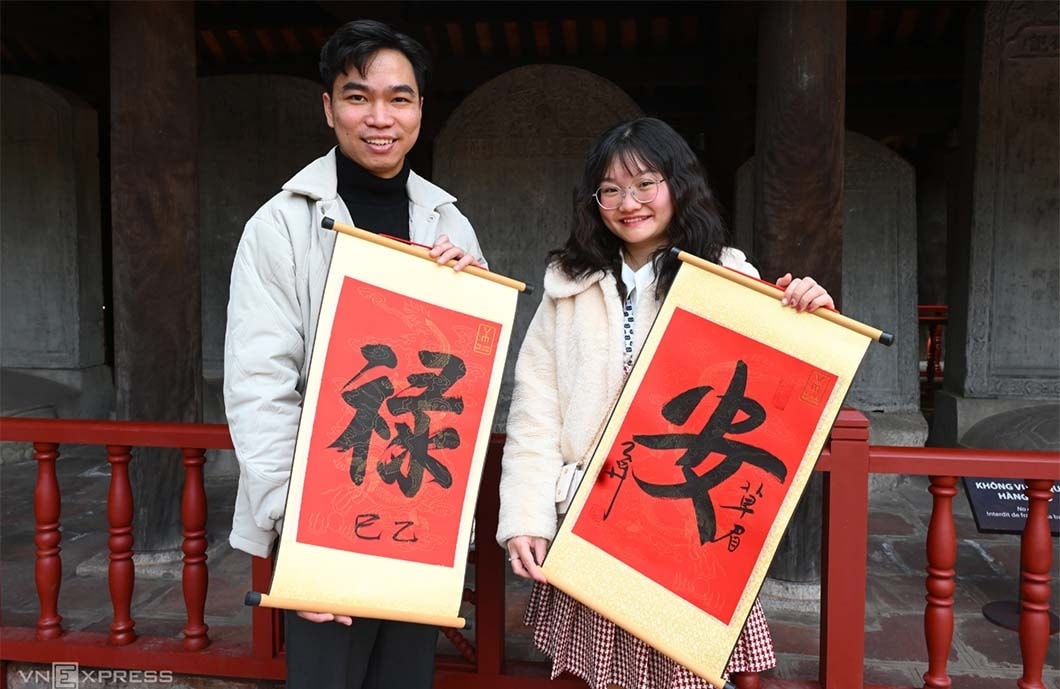 Du khách đến xin chữ dịp đầu năm tại Văn Miếu - Quốc Tử Giám dịp Tết nguyên đán năm nay. Ảnh: Giang Huy