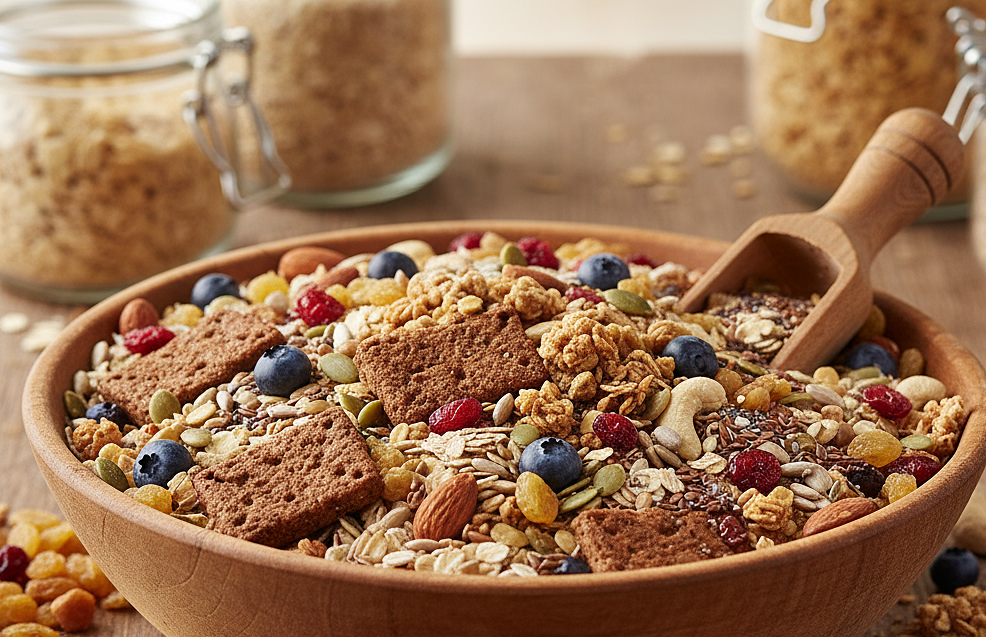 Ngũ cốc nguyên hạt chứa nhiều sắt, vitamin B và chất xơ hơn ngũ cốc tinh chế. Hỗn hợp dinh dưỡng này cân bằng mức năng lượng và giúp no lâu. Để tránh mệt mỏi, nên ưu tiên gạo lứt, hạt diêm mạch hoặc yến mạch. Bạn có thể dùng yến mạch nấu với sữa ăn sáng vì giàu dinh dưỡng, chứa đầy đủ vitamin, khoáng chất và chất xơ. Carbs trong các sản phẩm yến mạch như bột yến mạch giúp ngăn hạ đường huyết, mang lại năng lượng lâu dài.