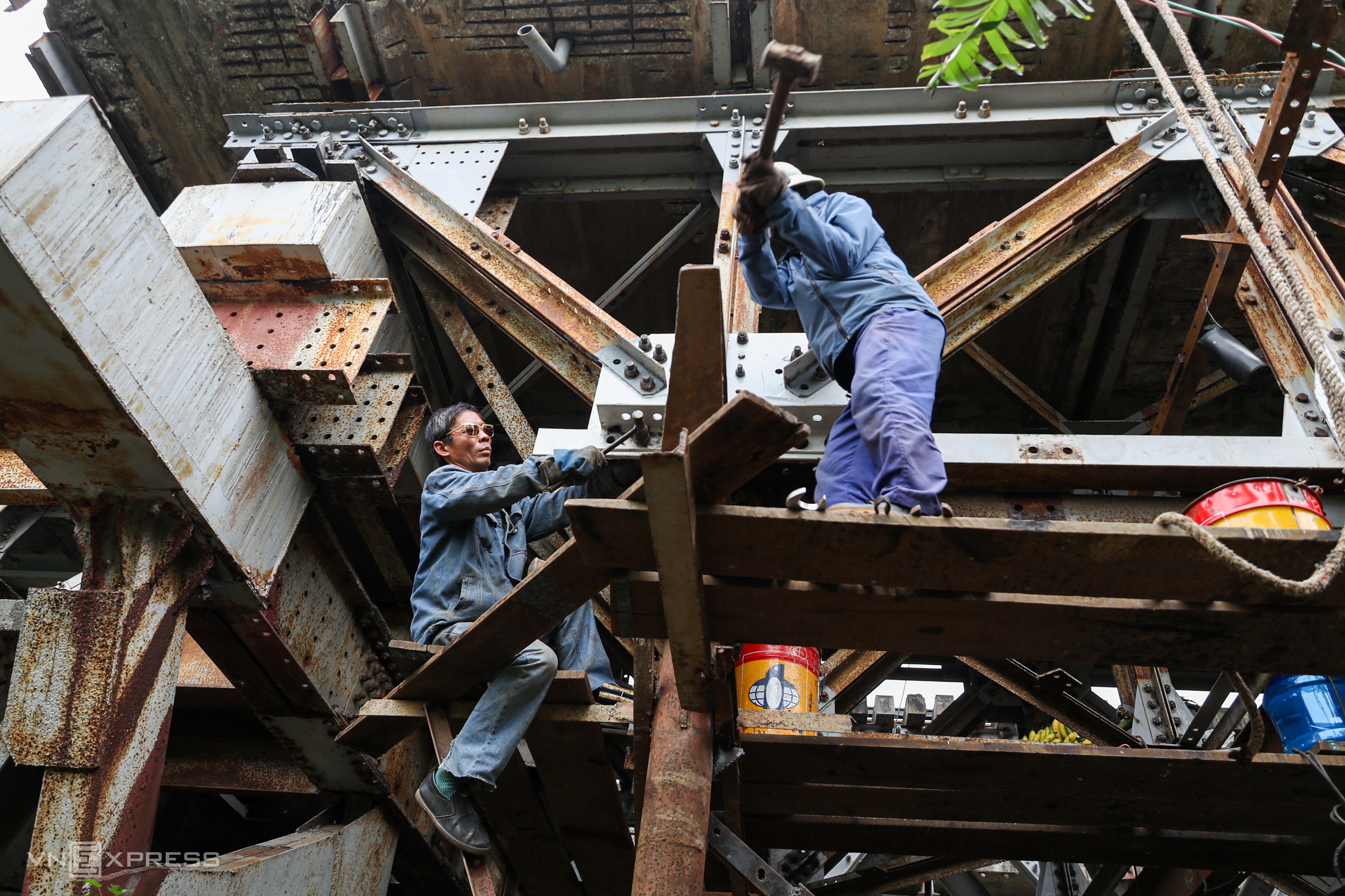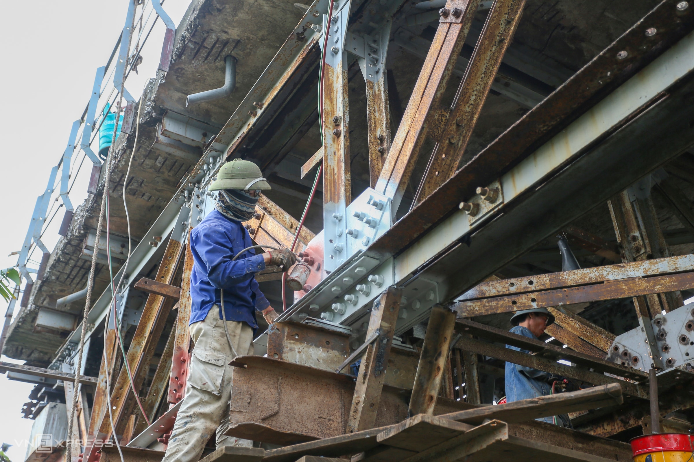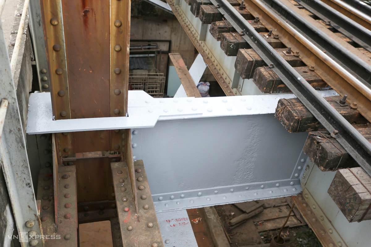 Dưới gầm cầu, hàng chục công nhân đang thay thế các bu lông, ốc vít bị rỉ sét. Sau khi lắp đặt xong, các chi tiết được sơn phủ để chống ăn mòn.