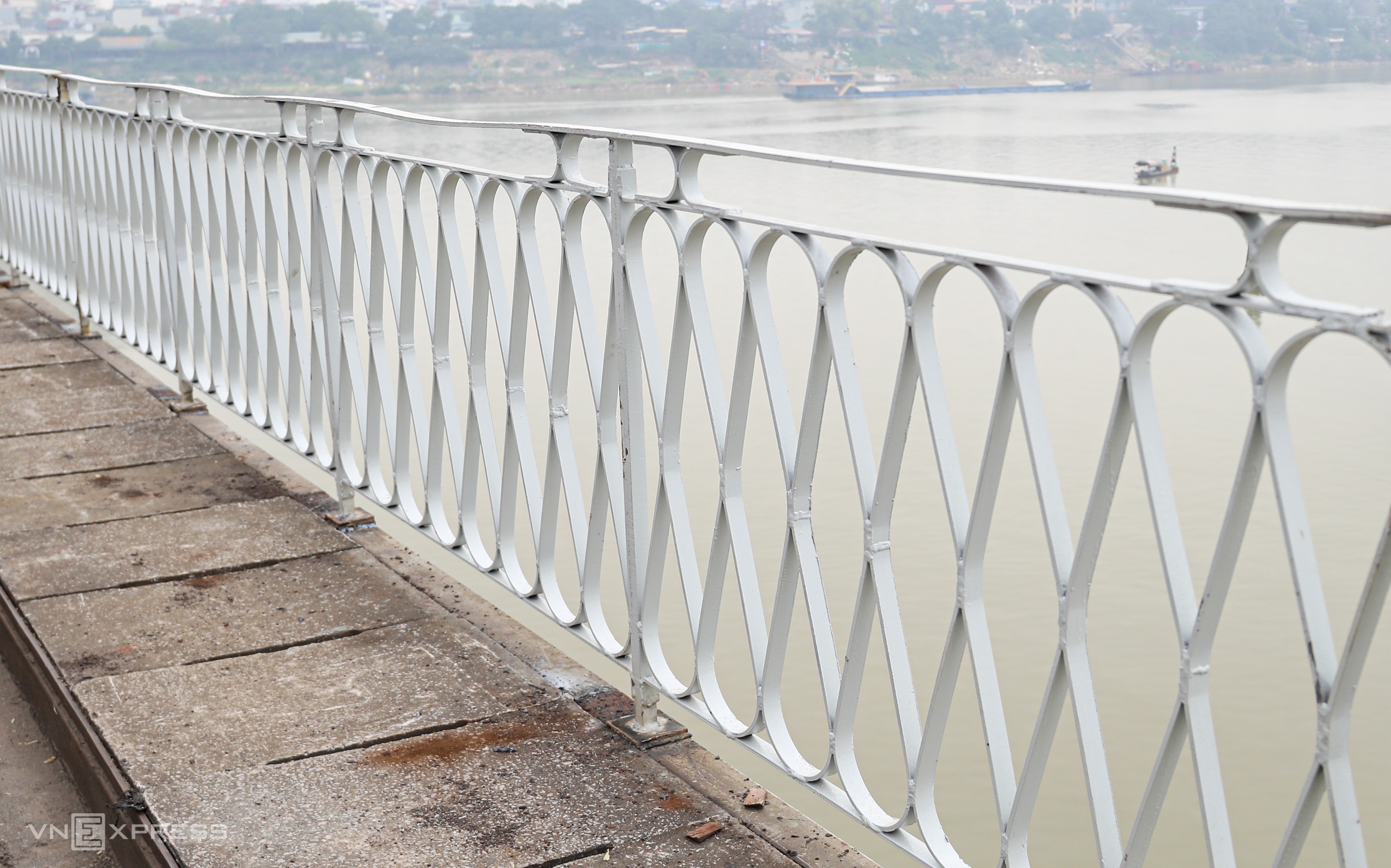 Cầu Long Biên lúc 10h sáng 31/12. Phần khung sắt đoạn vắt qua đường Trần Nhật Duật được phủ một lớp sơn trắng.