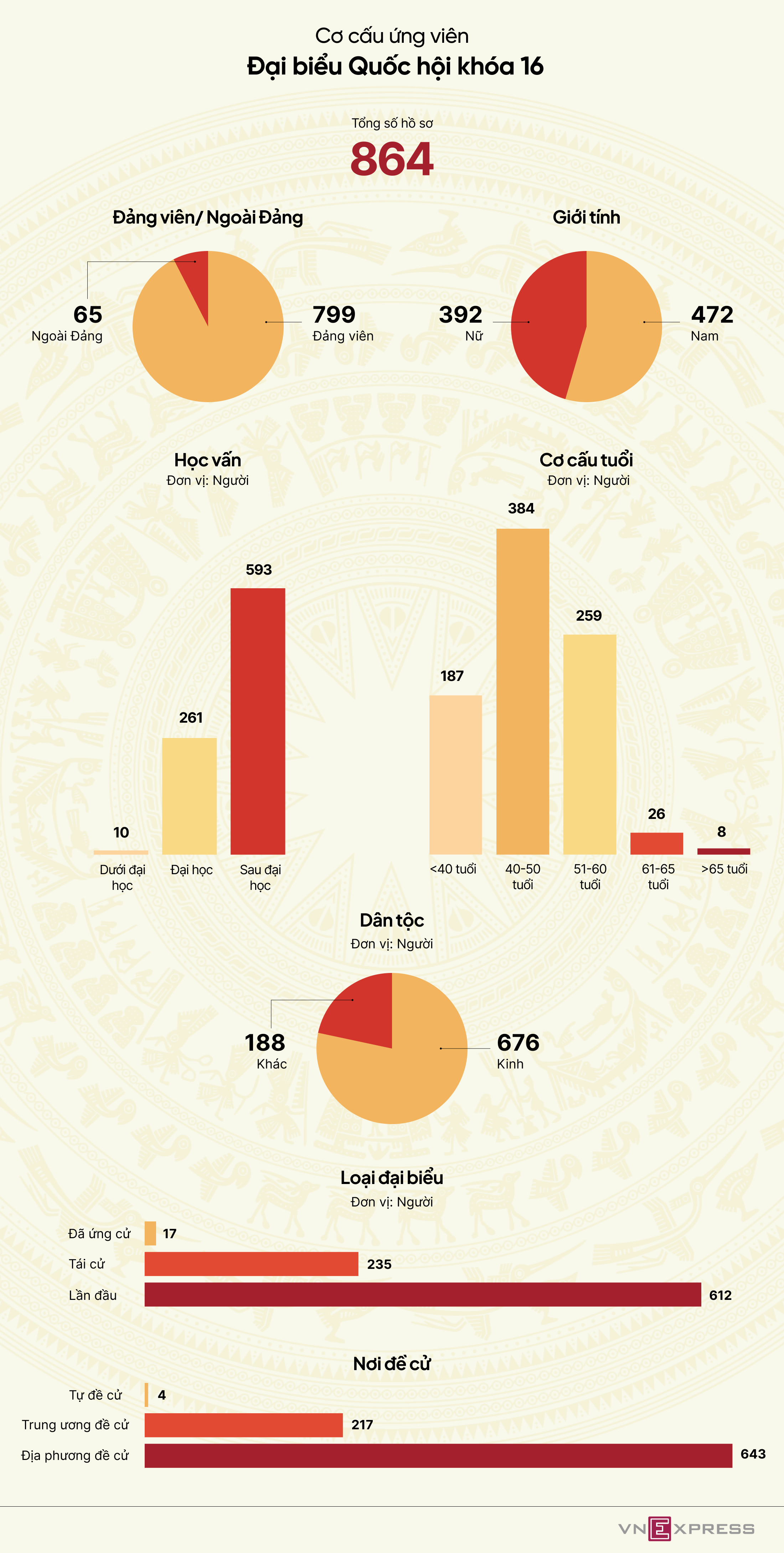 Trong 864 ứng viên Đại biểu Quốc hội khóa 16, có 799 Đảng viên, 65 người ngoài Đảng; người có trình độ sau đại học là 593 - gấp hơn hai lần số lượng cử nhân.