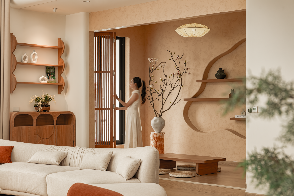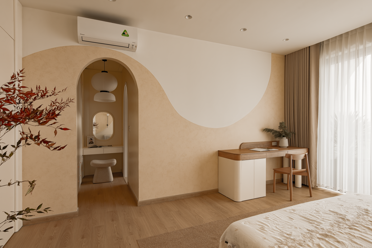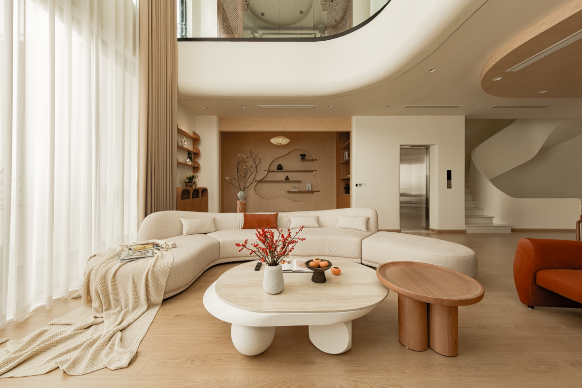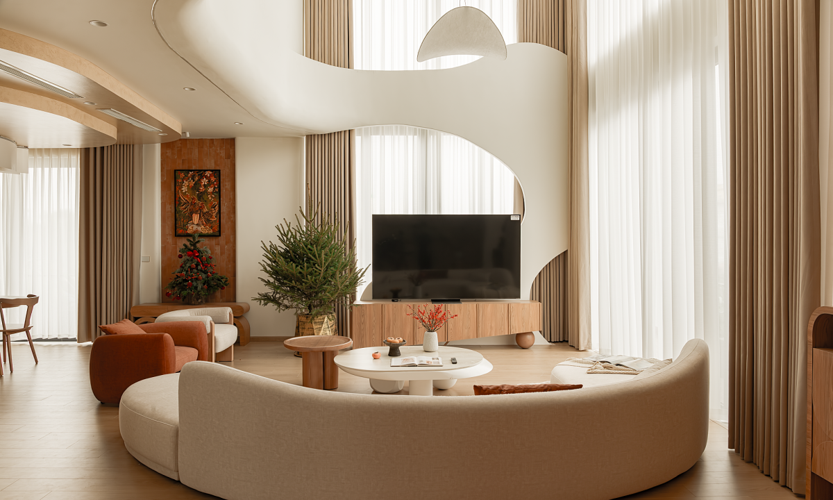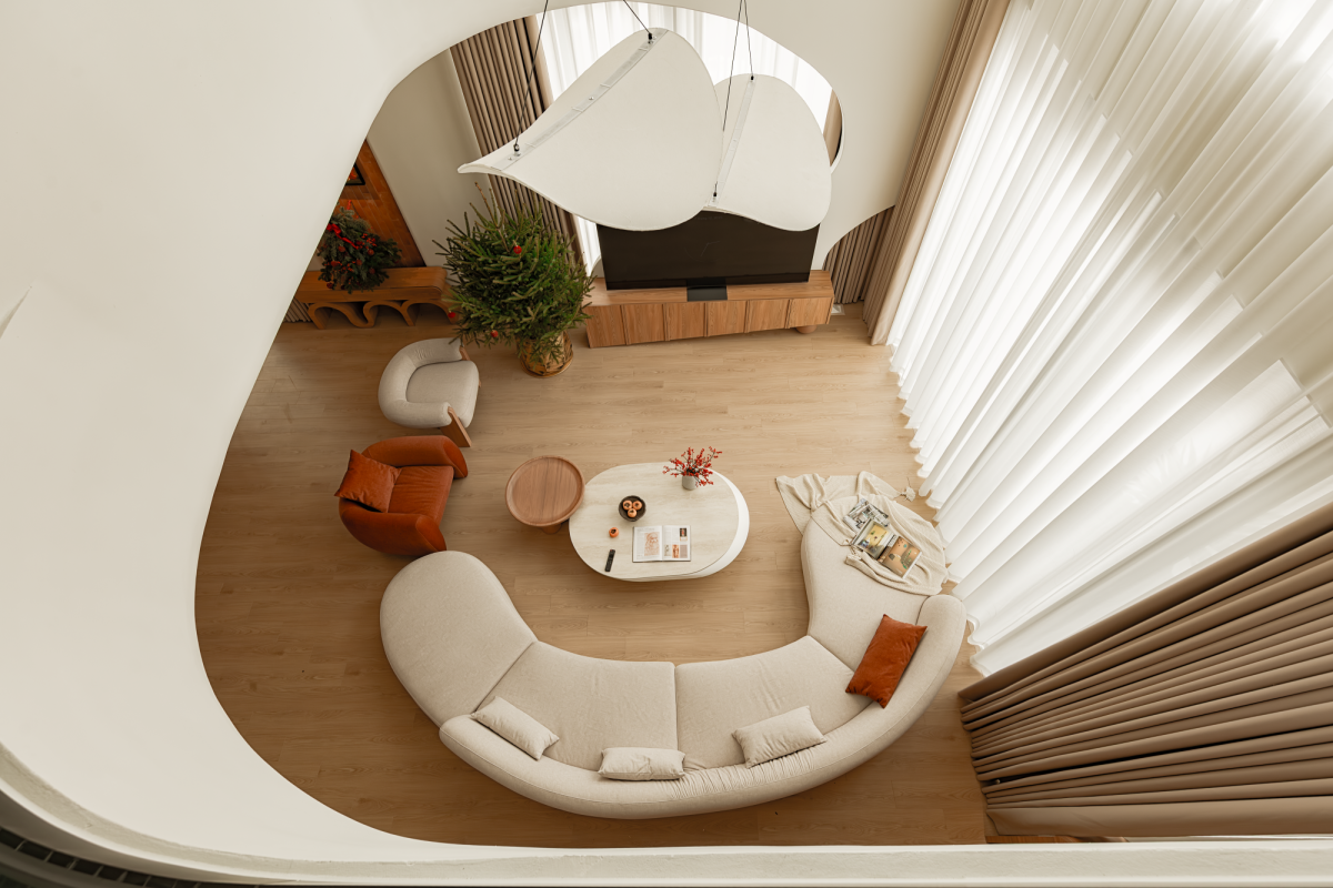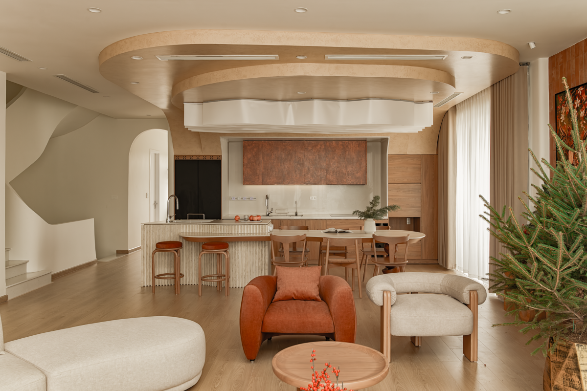 Nhà được tổ chức không gian một cách liền mạch, lấy đường cong làm yếu tố dẫn dắt thị giác và cảm xúc.