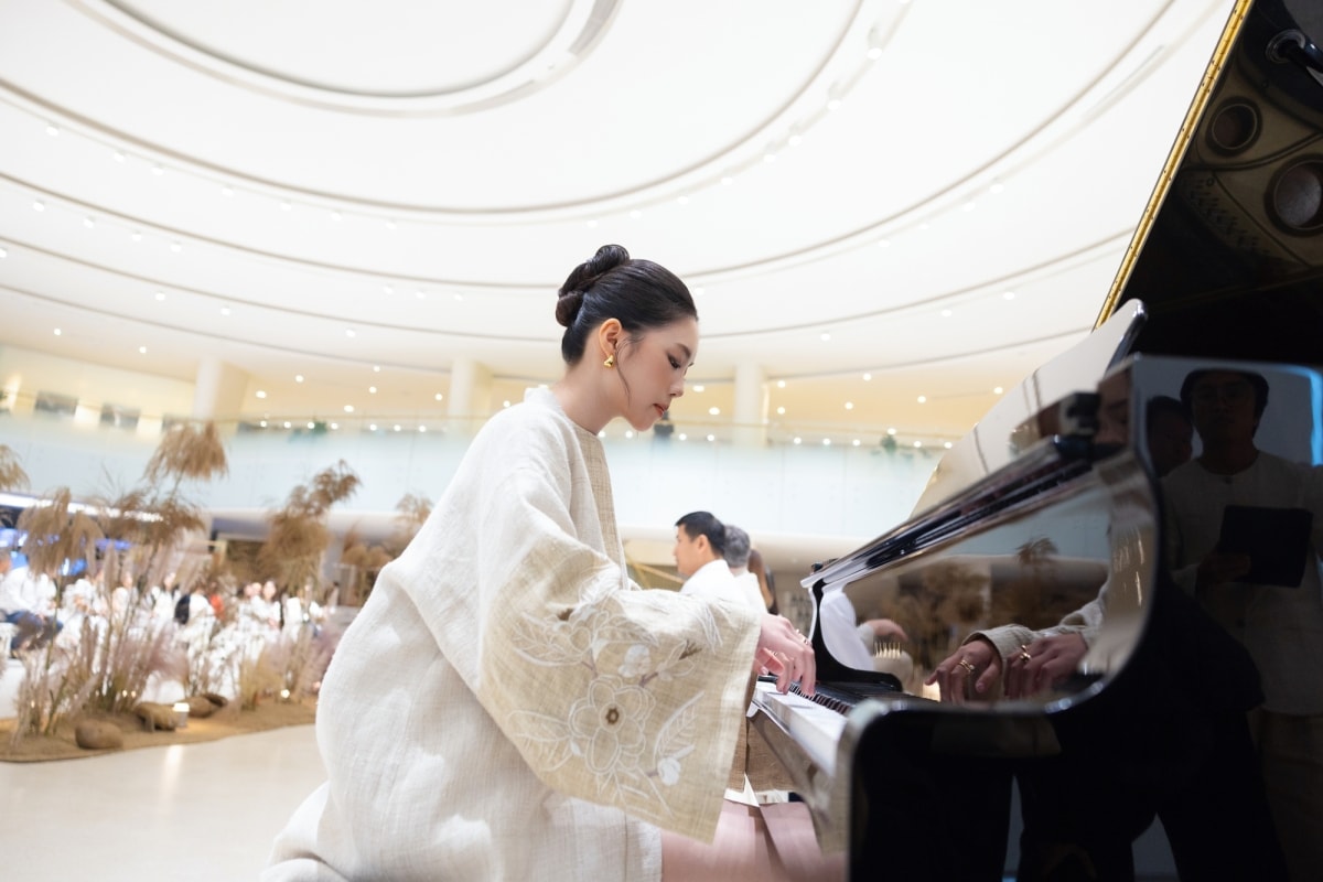Châu Anh mở màn cho bộ sưu tập Terrace hôm 2/11 bằng cách chơi một bản nhạc ngắn bên đàn dương cầm. Á hậu 22 tuổi nhận được tràng pháo tay cổ vũ của khán giả.