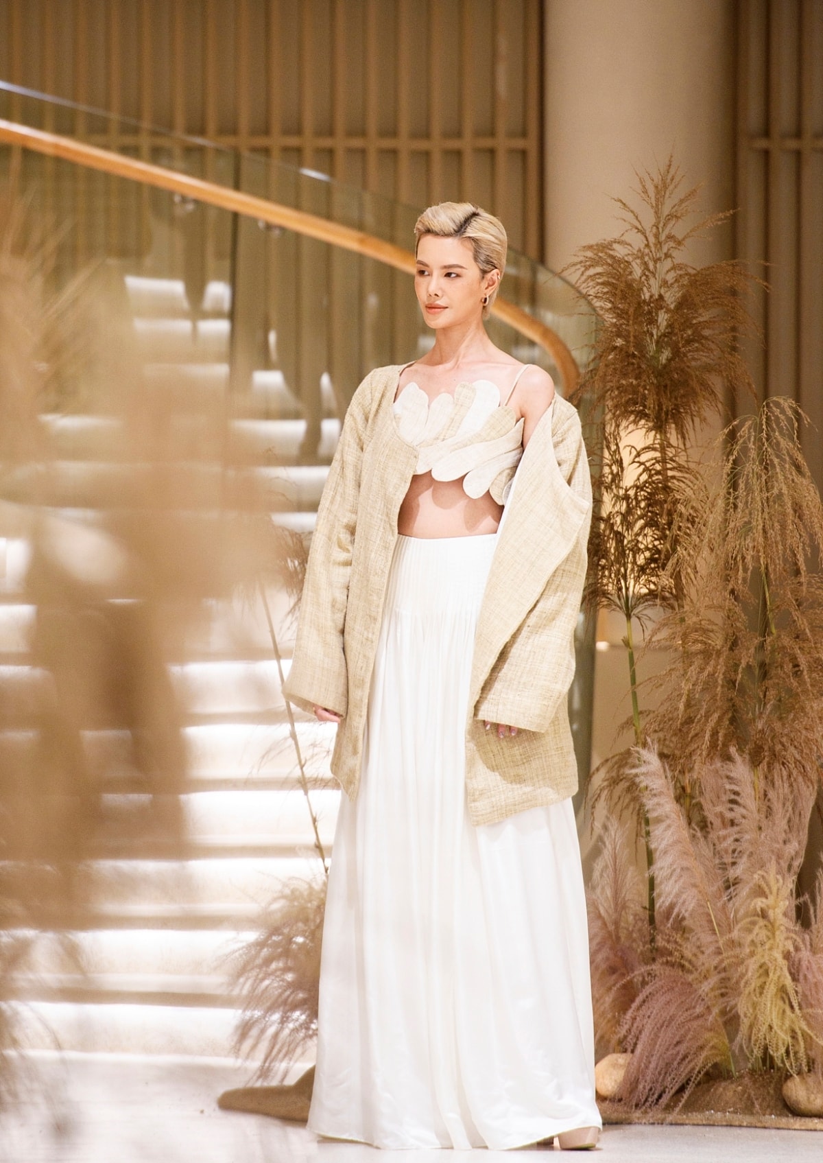 Sau đó, cô catwalk với váy chữ A, nhấn bằng nơ bất đối xứng sau lưng. Thiết kế làm từ sợi gai dầu dệt tay, mất hơn một tháng hoàn thiện.