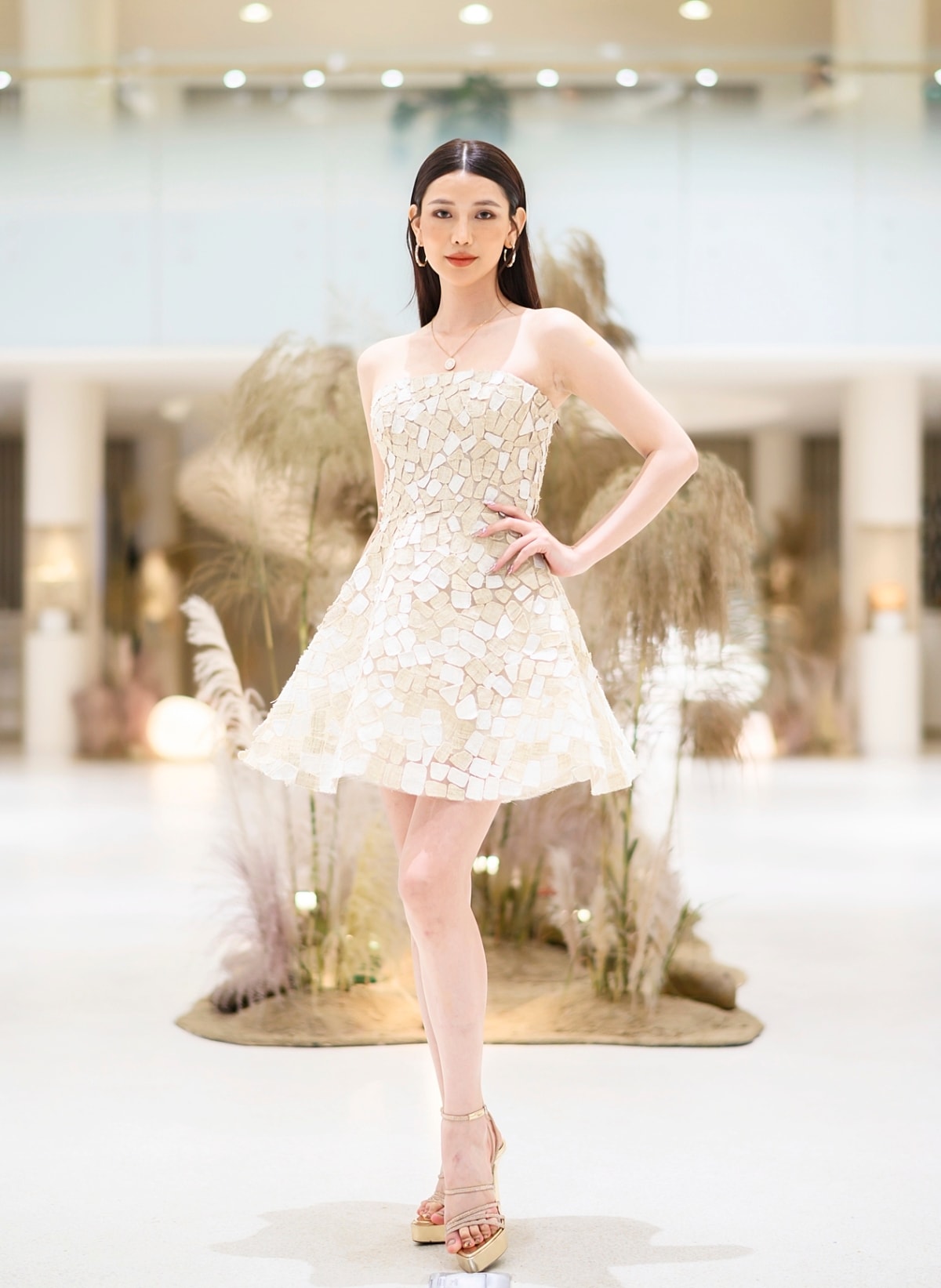 Bên cạnh các thiết kế dành cho công sở, show giới thiệu một số mẫu dự tiệc, trong đó có váy quây ngực được ghép từ nhiều mảnh vải vụn.