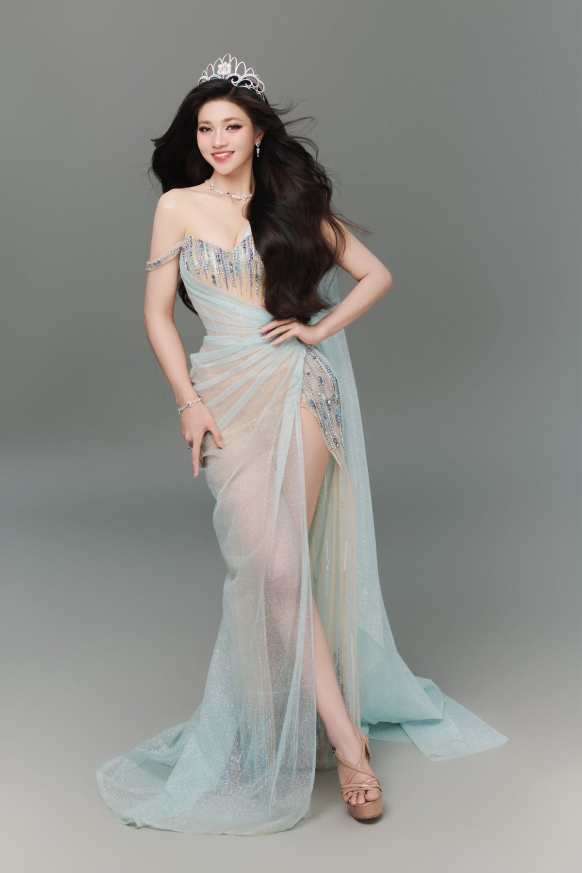 Á hậu tạo dáng với đầm xuyên thấu của nhà thiết kế Brian Võ trong bộ ảnh trước khi kết thúc nhiệm kỳ.