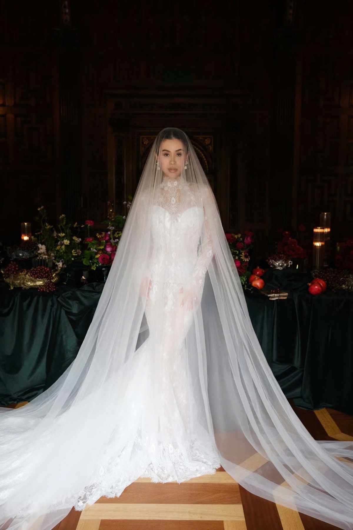 Người đẹp mặc thêm kiểu đầm cưới dáng đuôi cá, đắp ren xuyên thấu.