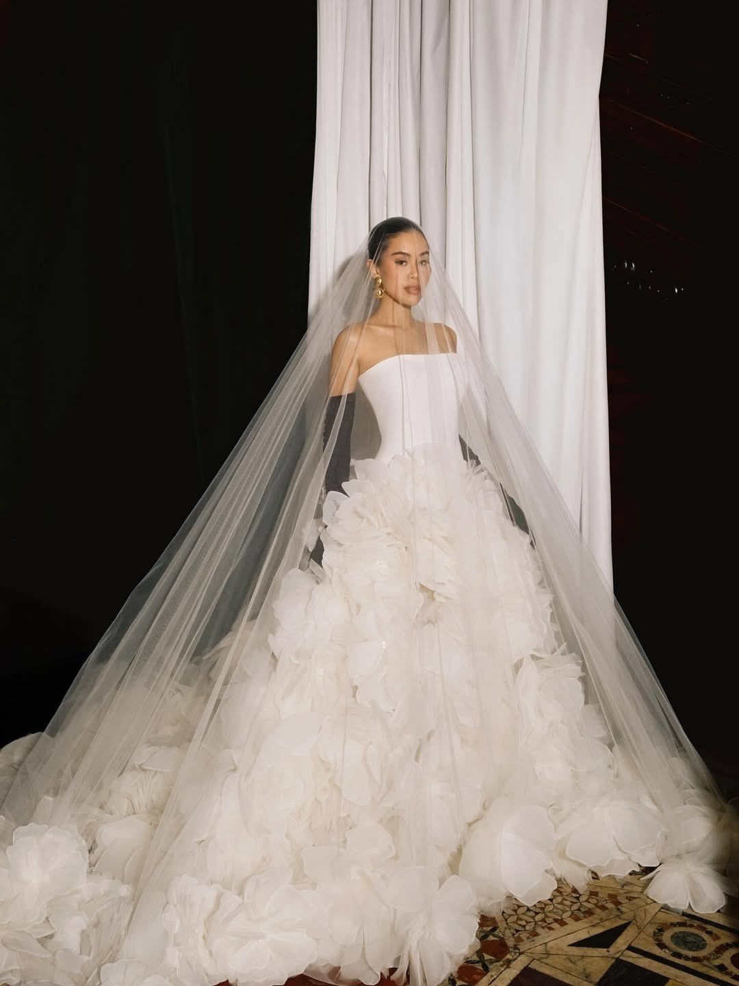 Trang phục có phom dáng cúp ngực, đính hoa 3D khắp phần thân dưới. Váy cưới của thương hiệu này thường có giá thấp nhất khoảng 4.000 USD (hơn 100 triệu đồng), cao nhất khoảng 20.000 USD (hơn 520 triệu đồng).