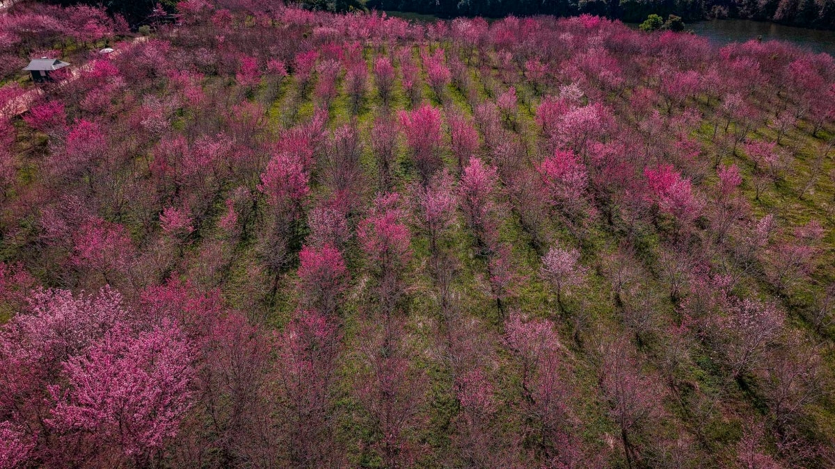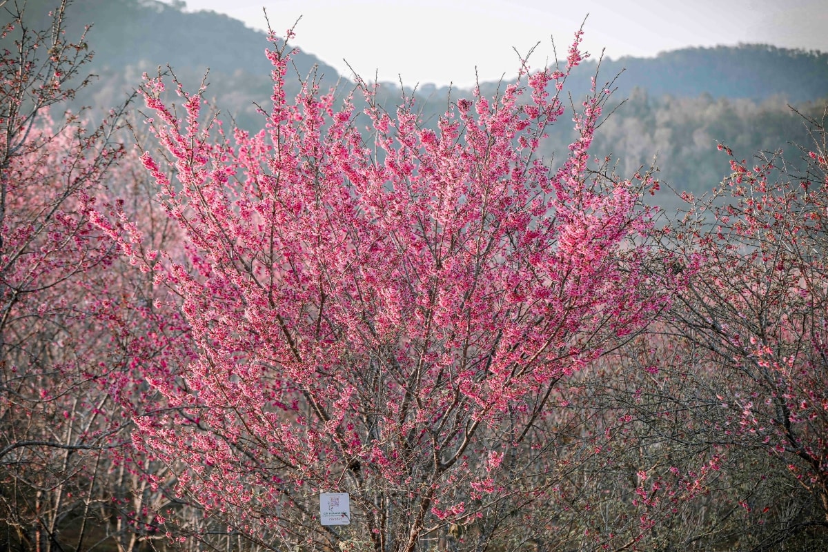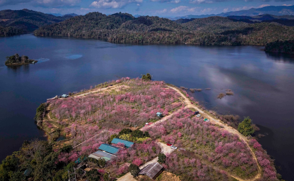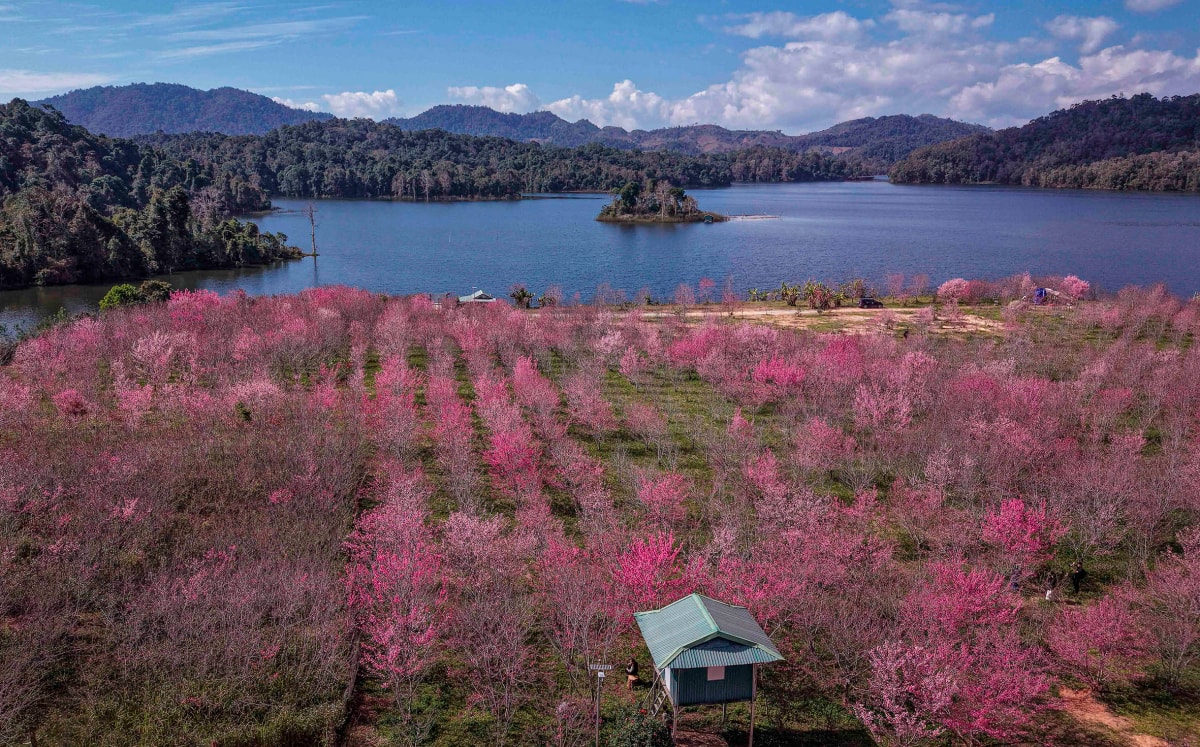 Hàng chục nghìn gốc hoa anh đào Nhật Bản trồng trên đảo giữa hồ Pá Khoang, Điện Biên đồng loạt khoe sắc, hấp dẫn du khách trước lễ hội vào 9-11/1.