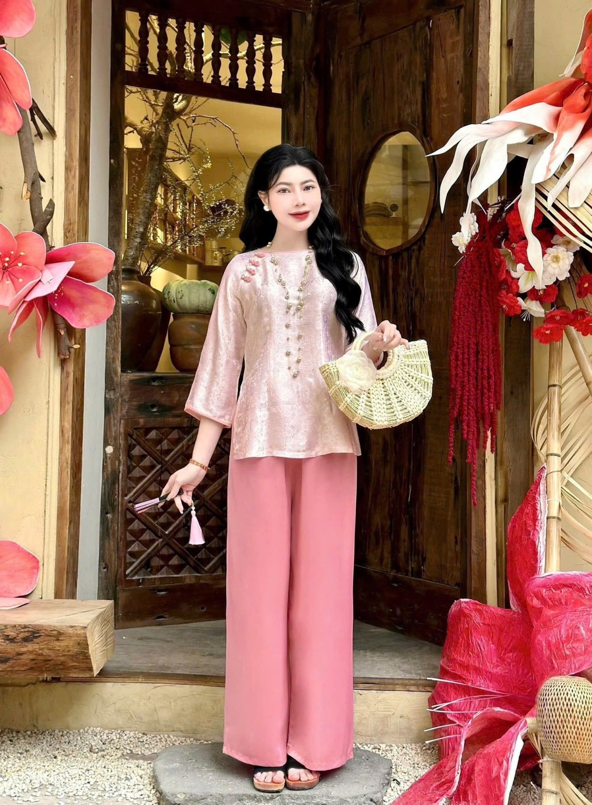 Blogger làm đẹp Mai Vân Trang chia sẻ cách phối áo bà ba đi chơi Tết.
