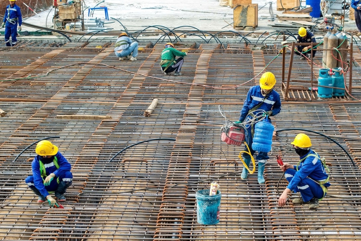 Công nhân thi công mặt cầu vượt sông Lạch Tray thuộc dự án vành đai 2.