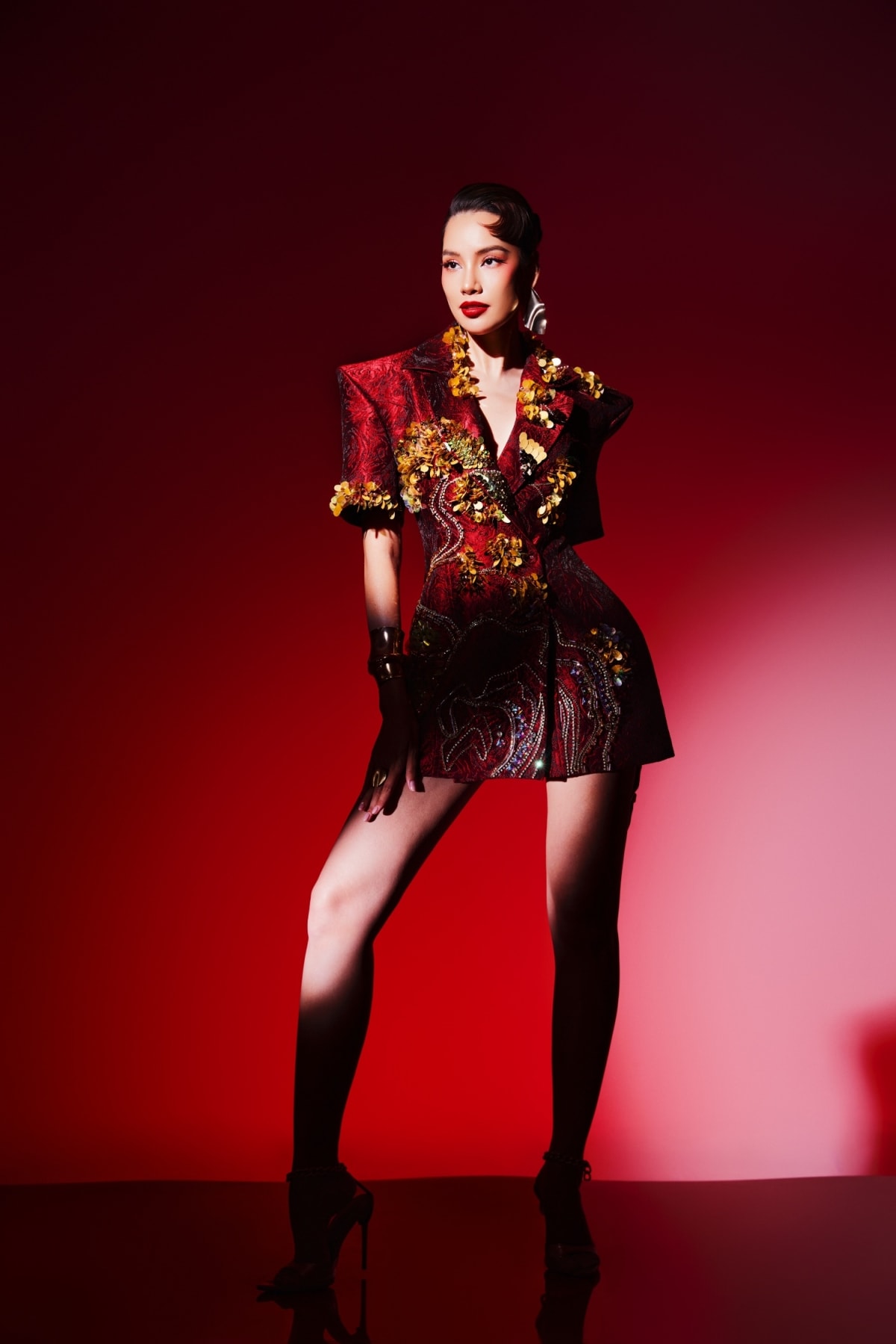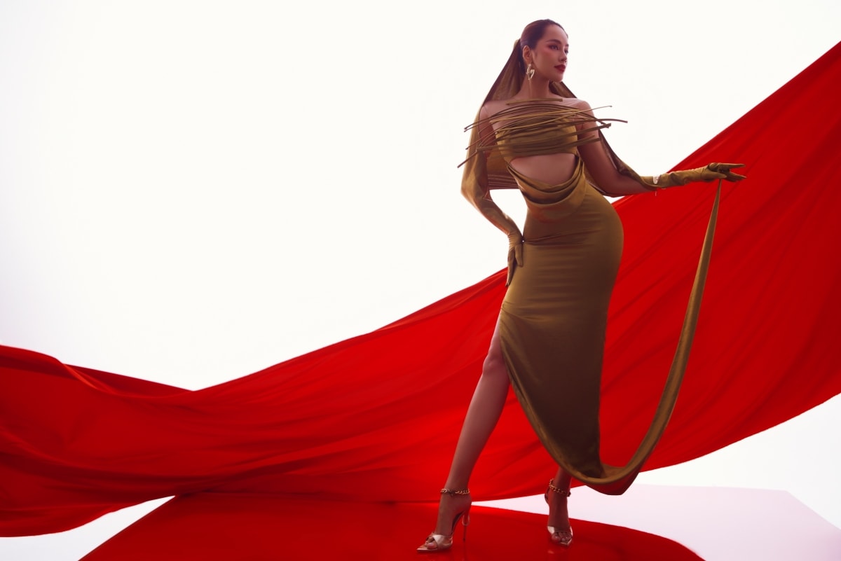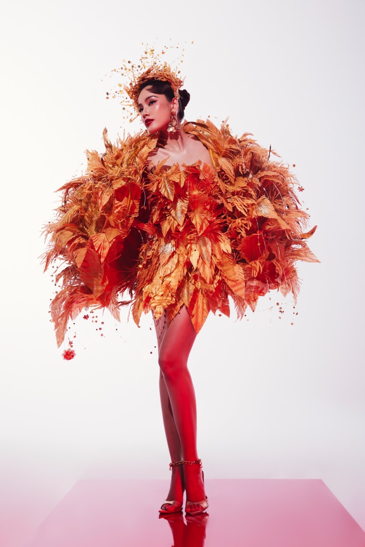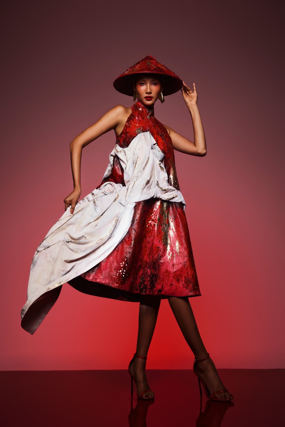 Hoàng Thùy thể hiện các mẫu thiết kế của dự án.